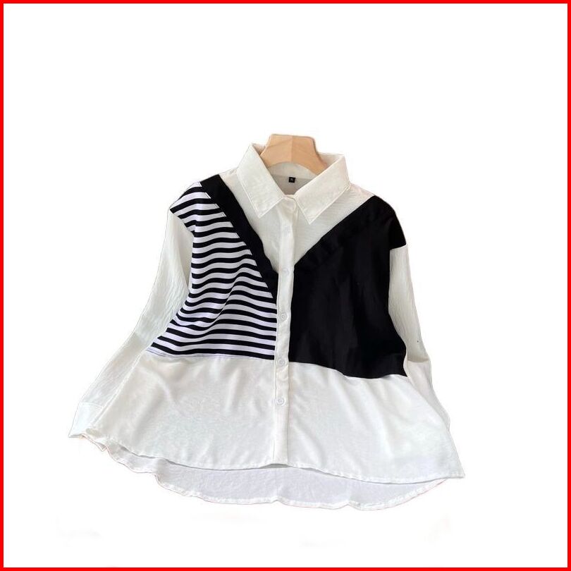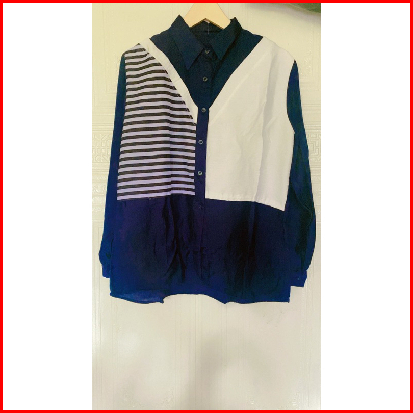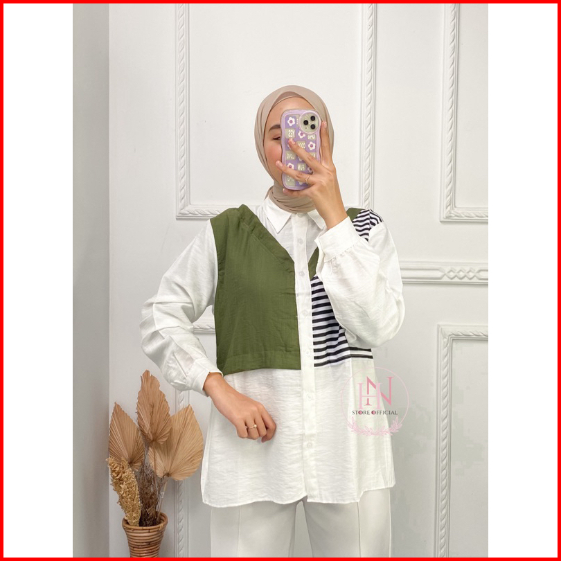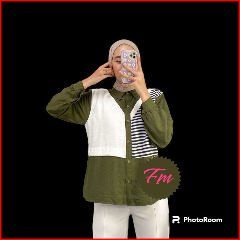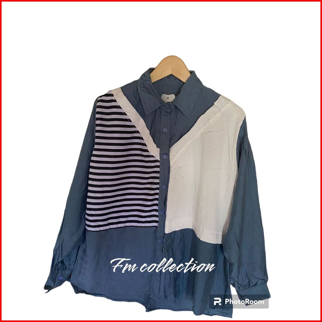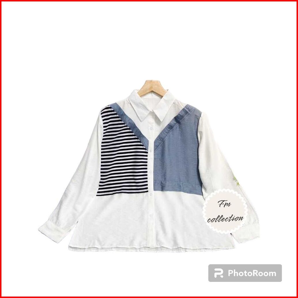 Silvia Kemeja Pollo Linen Kombinasi Salur Style Korean