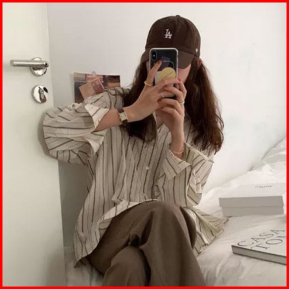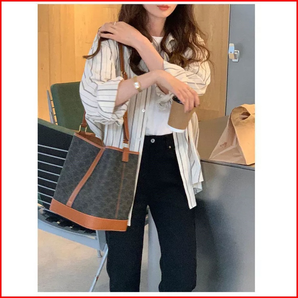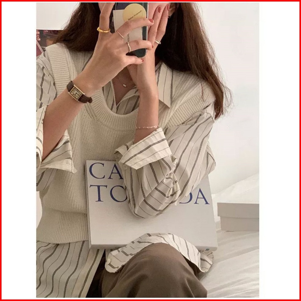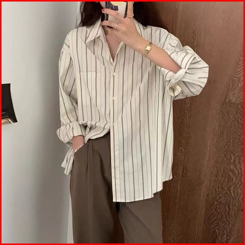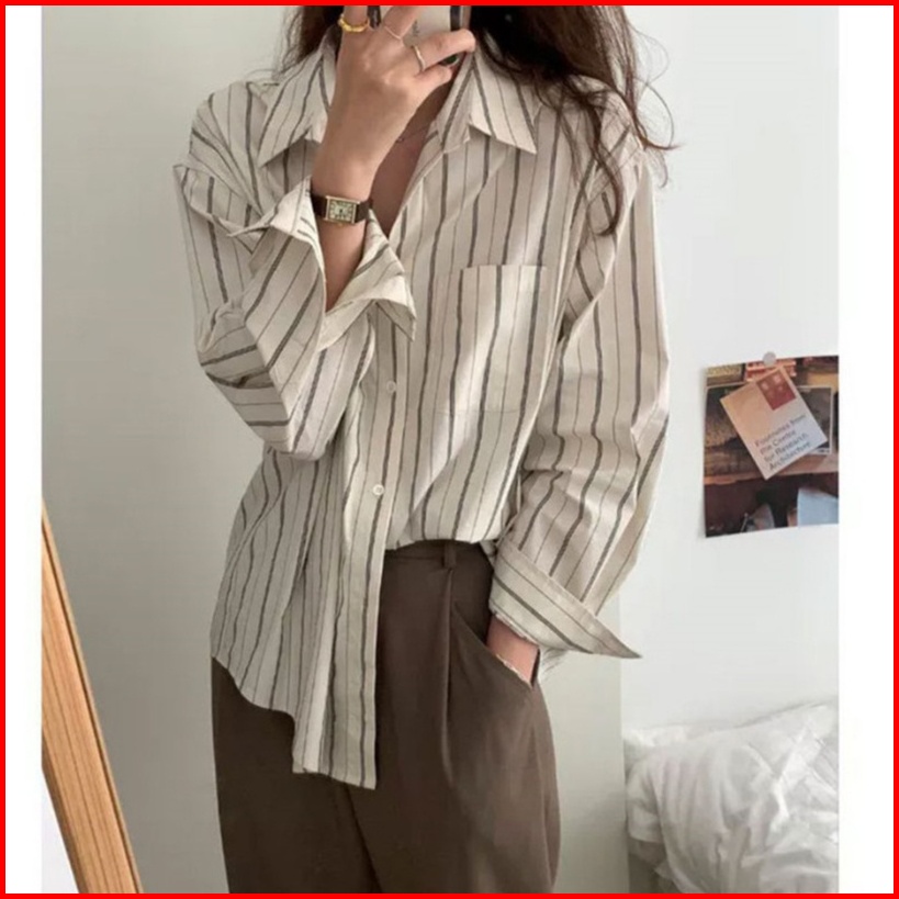 Ekouaer Kemeja Lengan Panjang Kekinian Stripe Causual Korean Style Import Blouse Wanita M L Xl