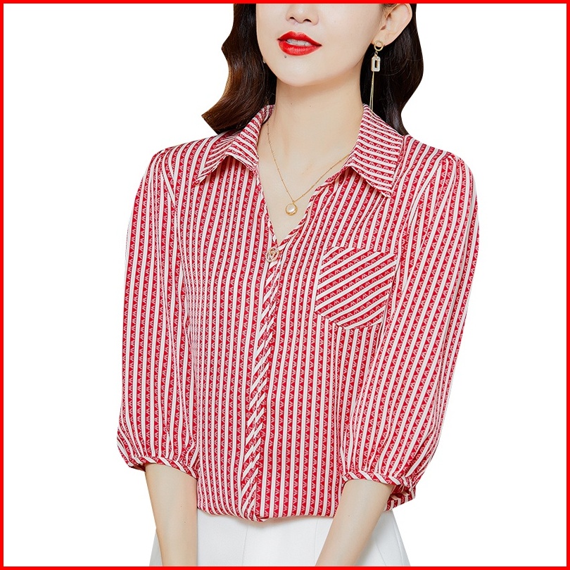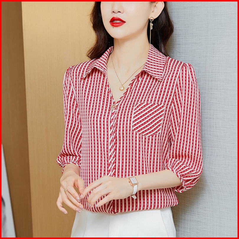New Fashion Korean Style Red Black Stripes Women Blouse Summer 3 4 Sleeve Length Shirts Tops