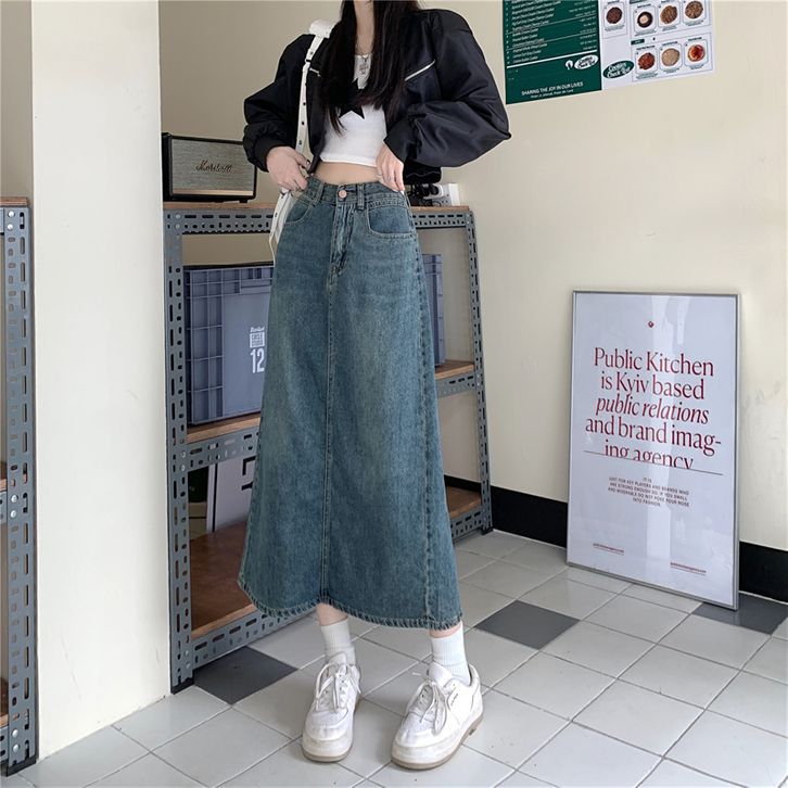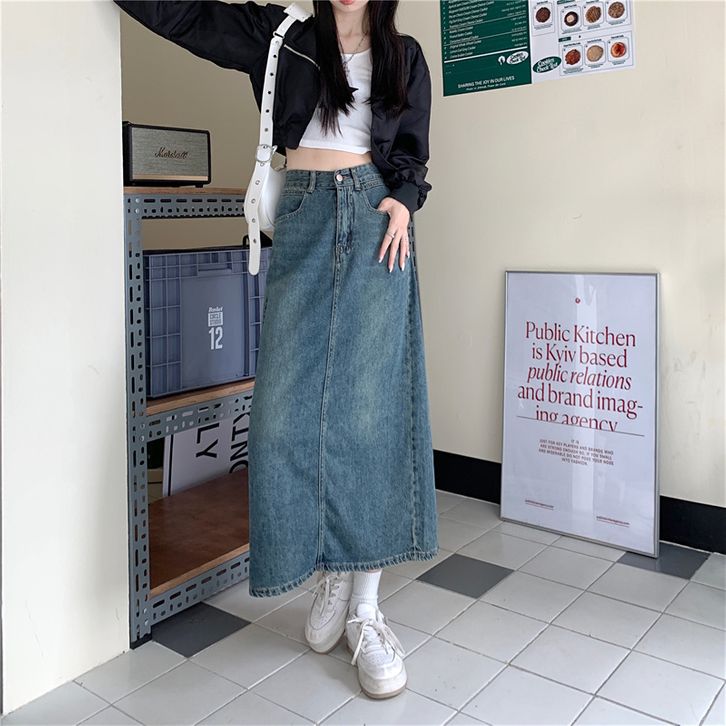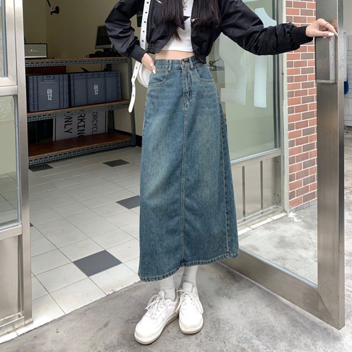 Rok Cewek Midi Denim Fashion Rok A-line Rok Wanita Highwaist Biru Retro Bawahan Wanita Denim Kasual Kekinian