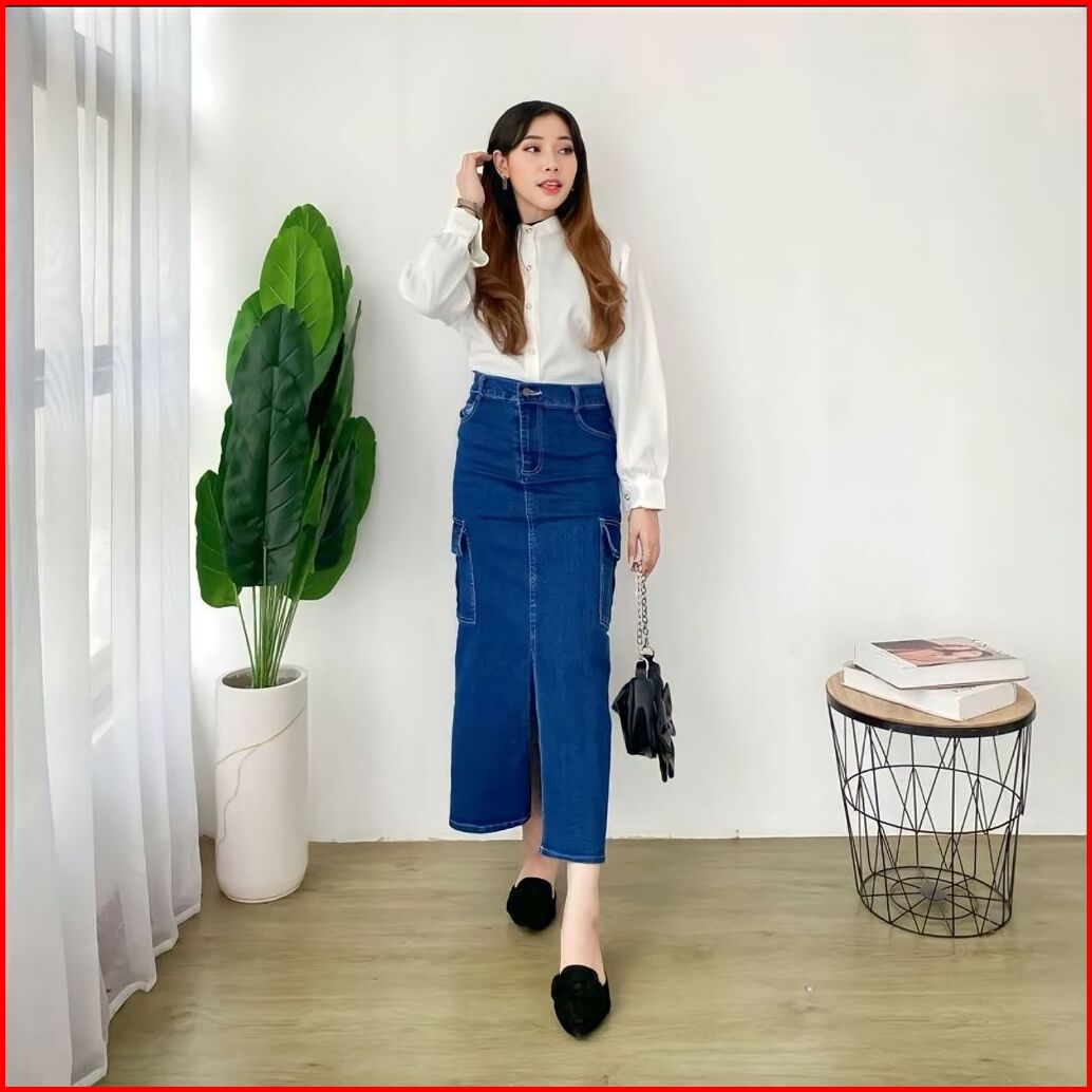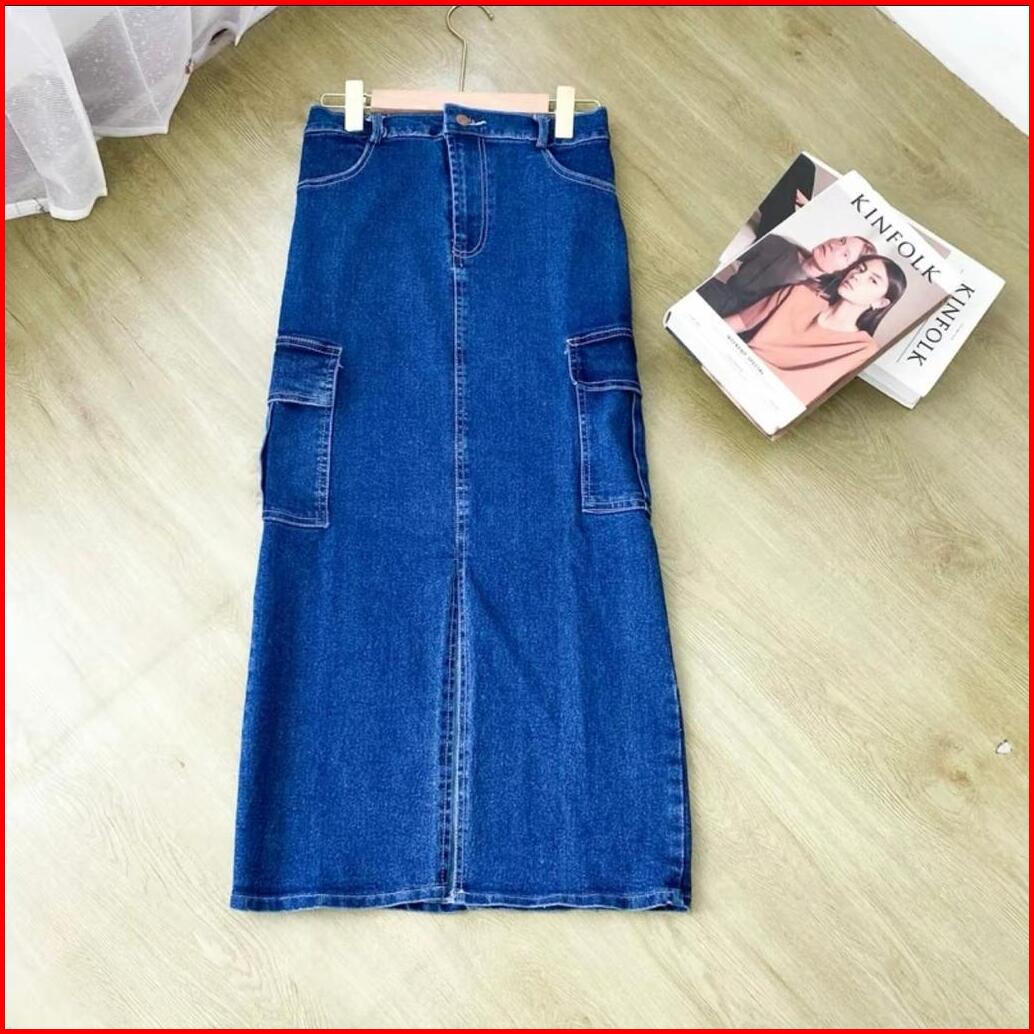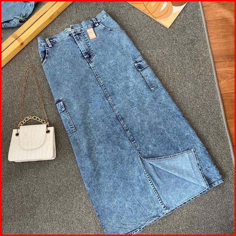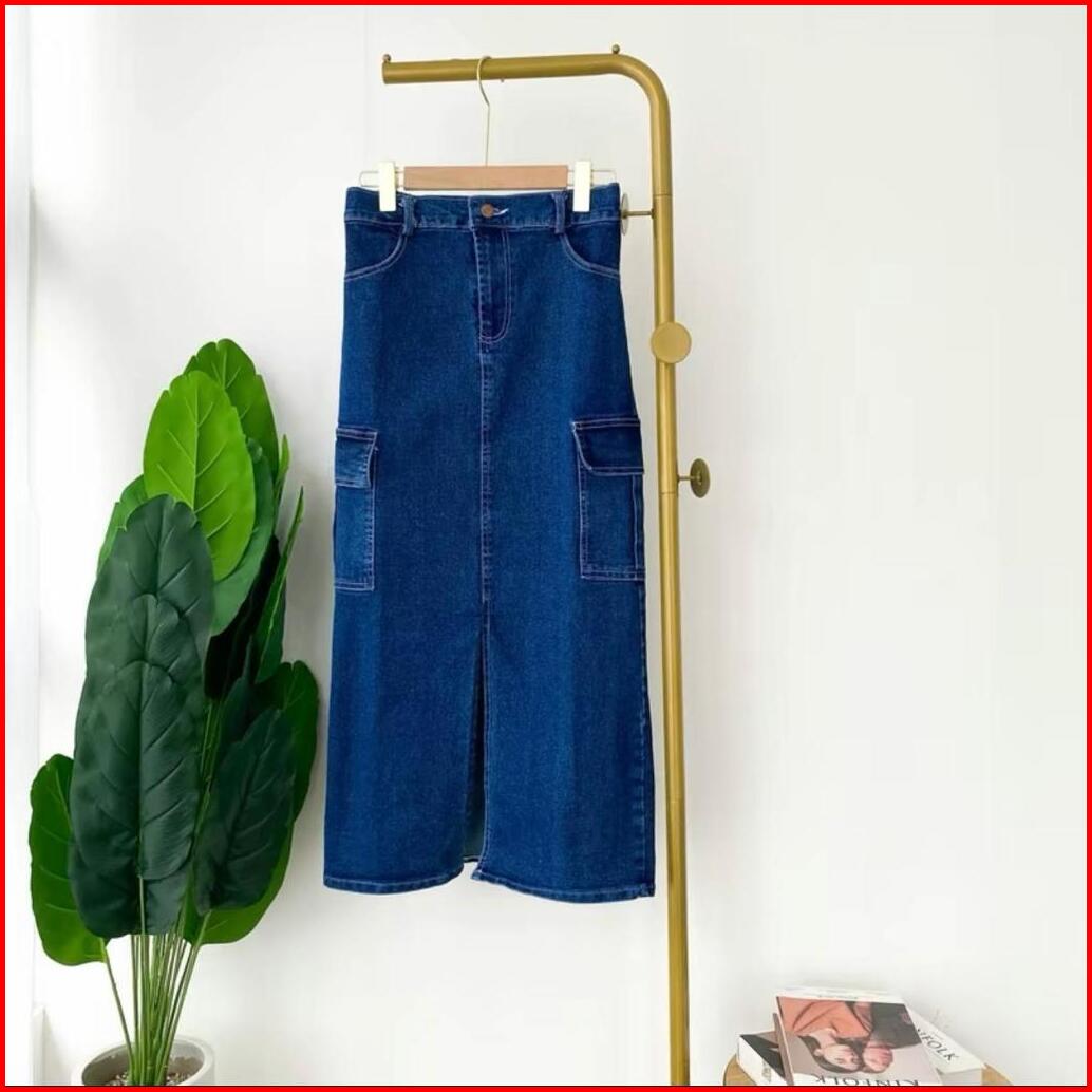 Bkofficialstore - Rok Cargo Jeans Wanita Kekinian - Rok Cargo Jeans Wanita A-line Highwaist Belah Depan
