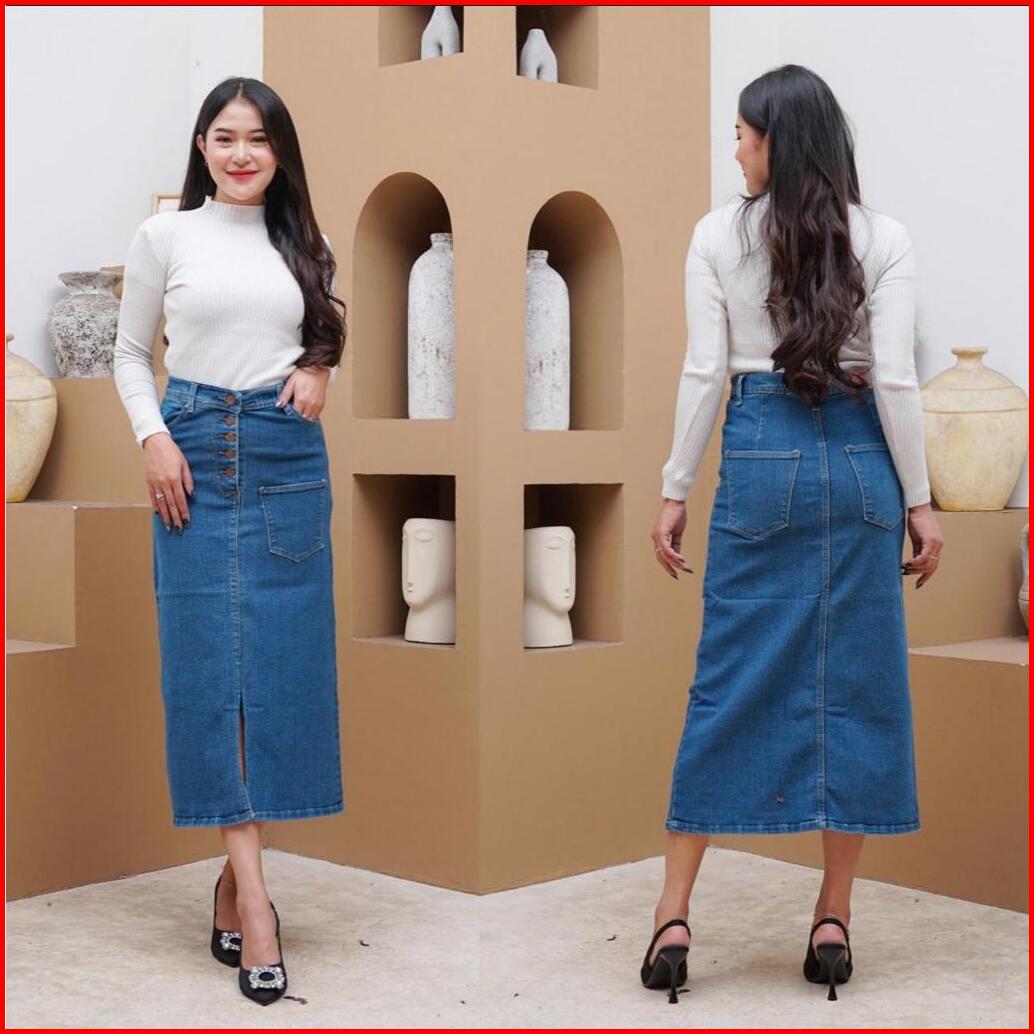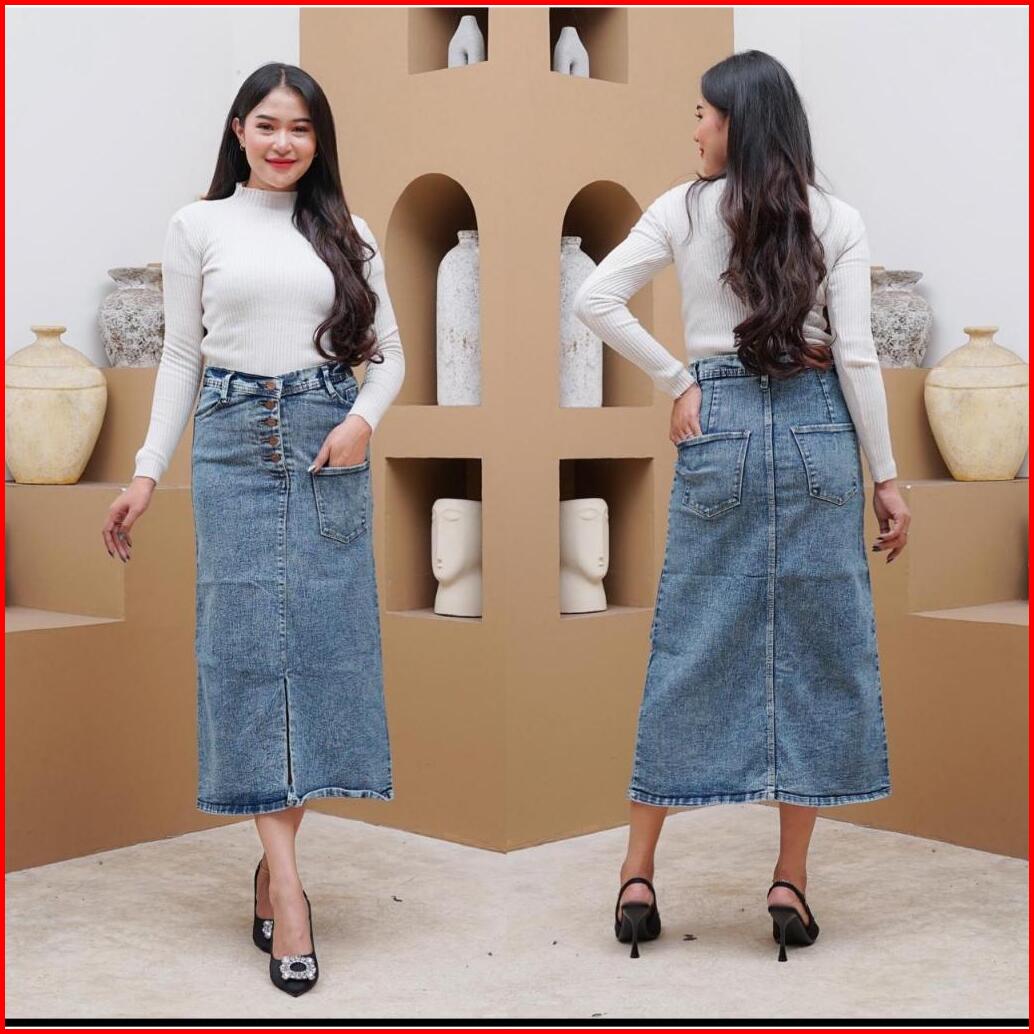Rok Jeans Wanita Kancing Depan Belah Depan Stretch Rok Jeans Merce - St27nyell