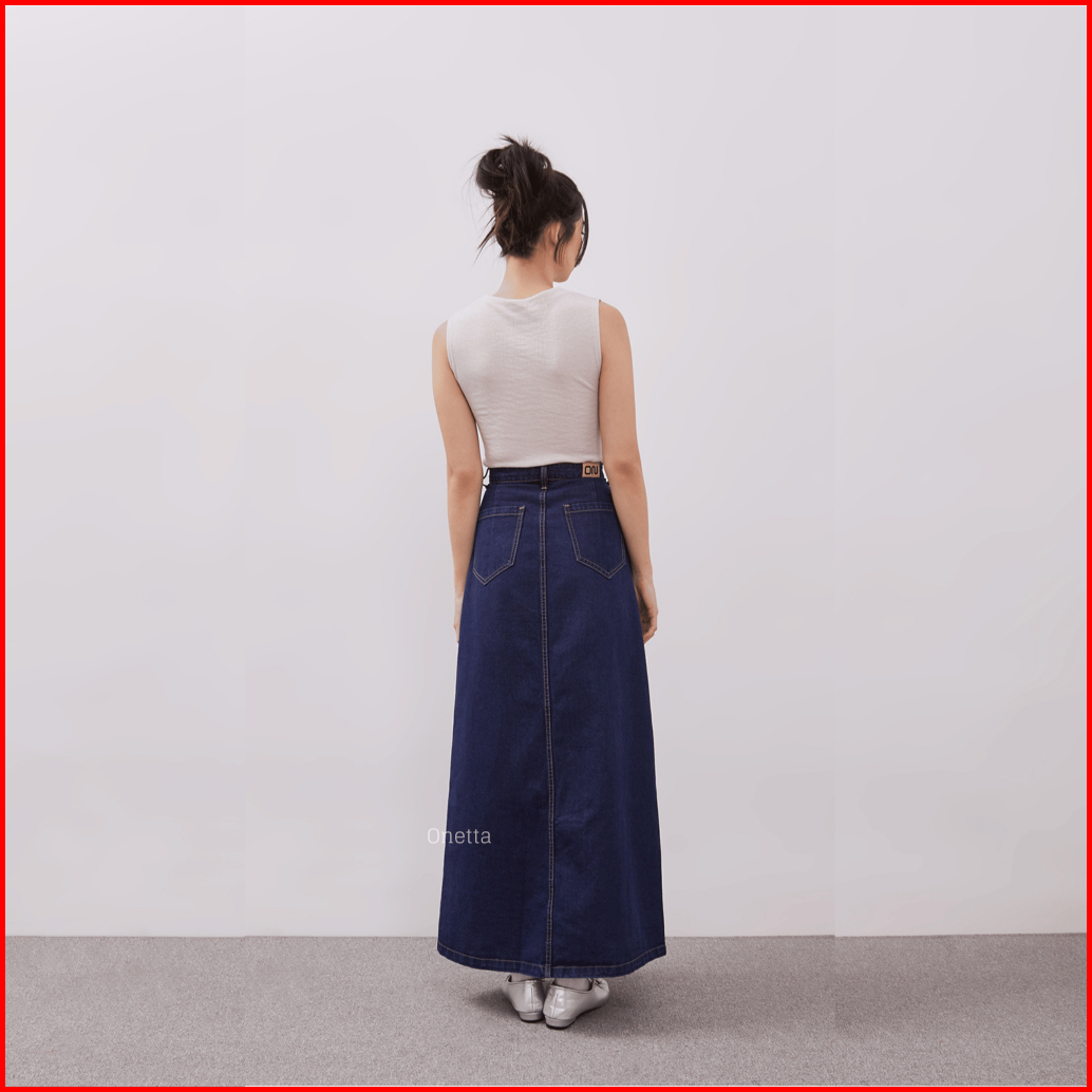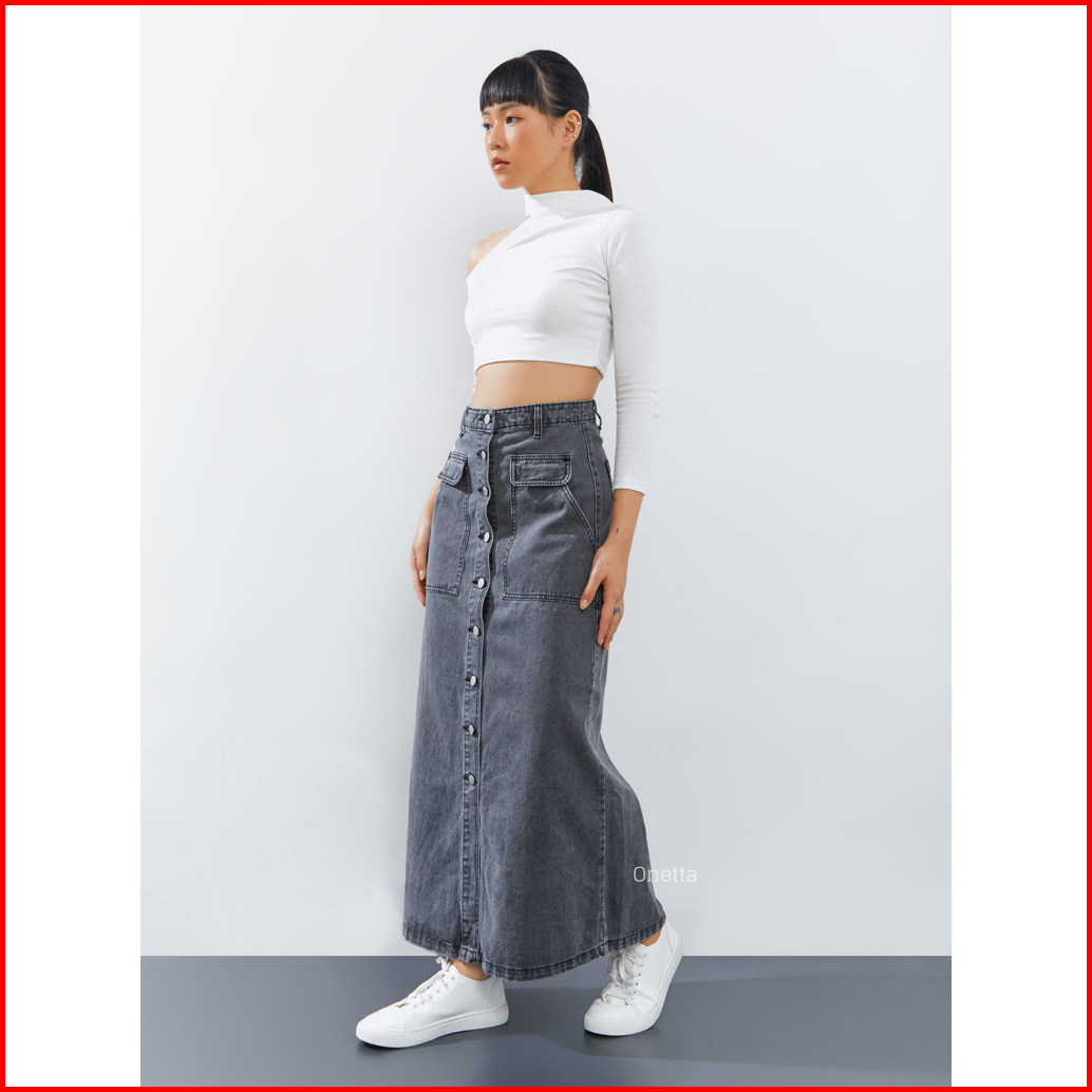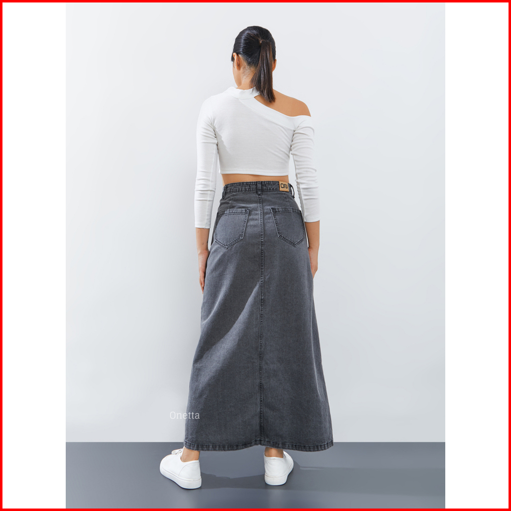 Rok Jeans High Waist A Line Variasi Kancing Hijab Friendly Harper Maxi Skirt - Onetta