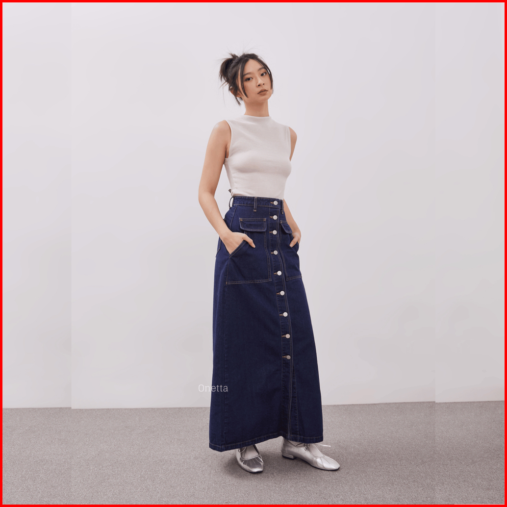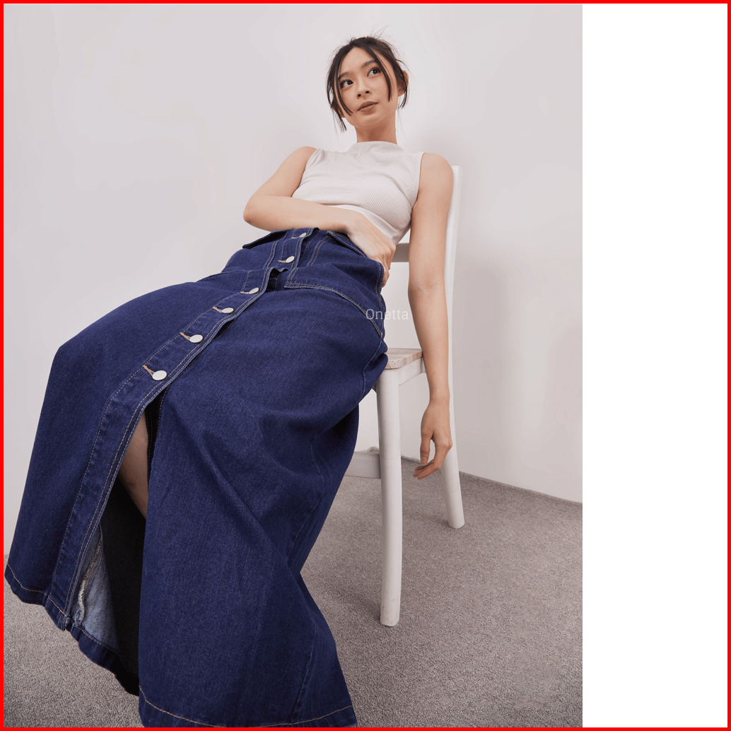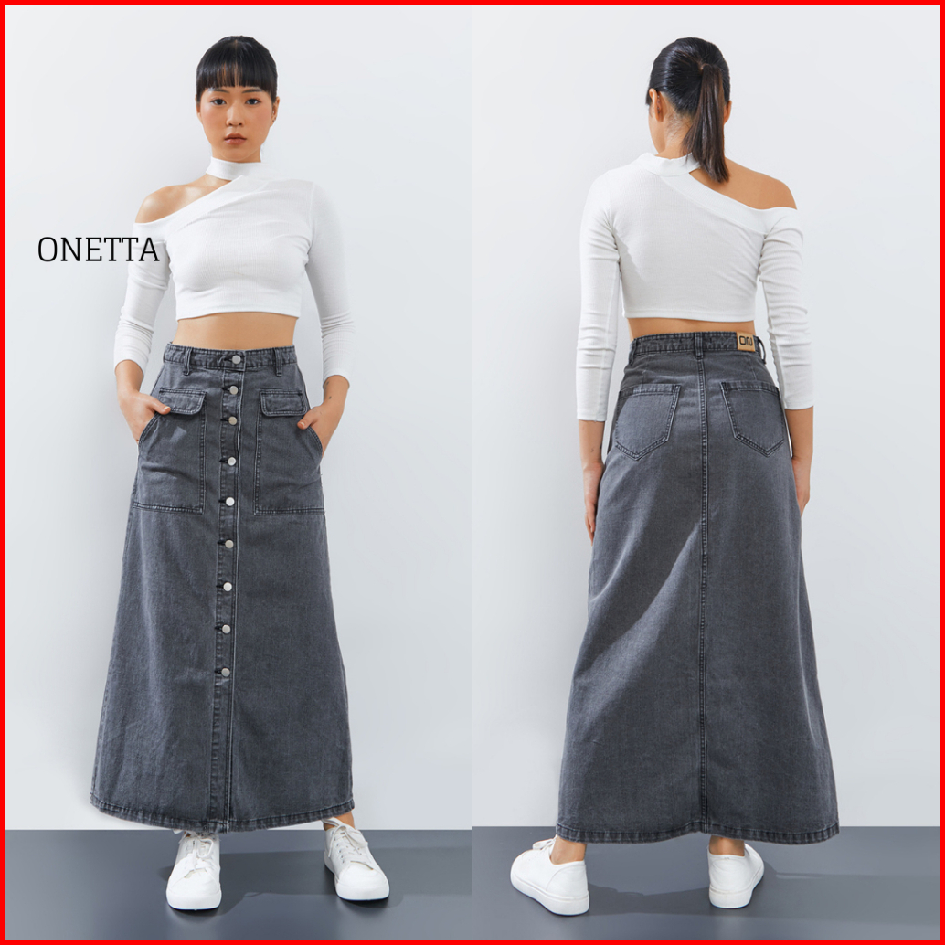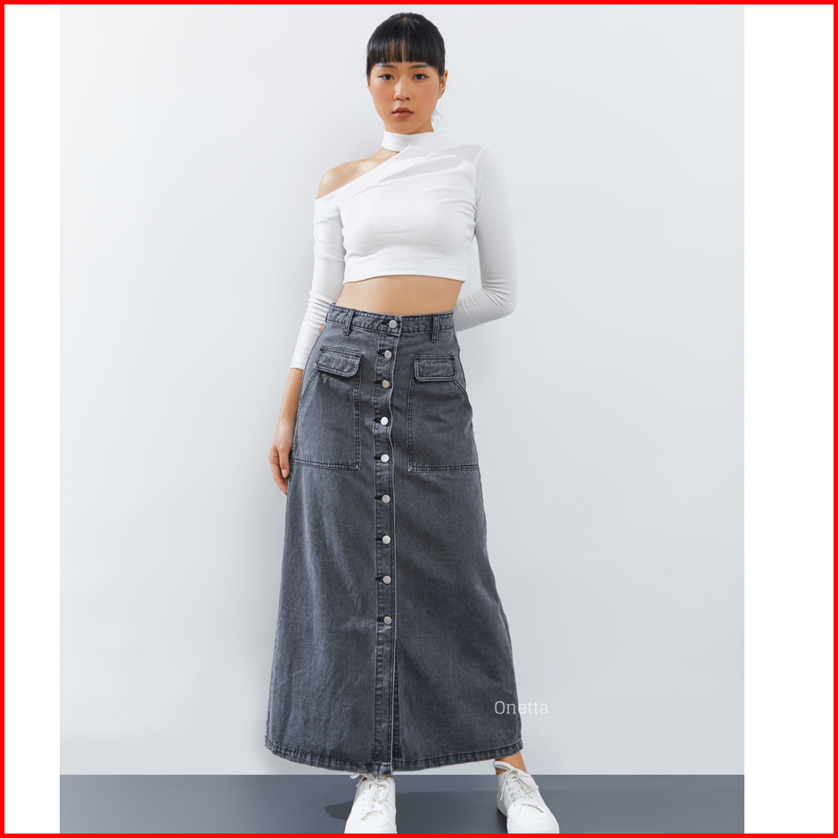 Rok Jeans High Waist A Line Variasi Kancing Hijab Friendly Harper Maxi Skirt - Onetta