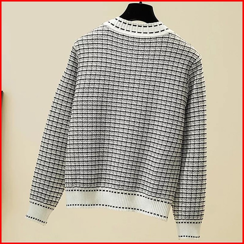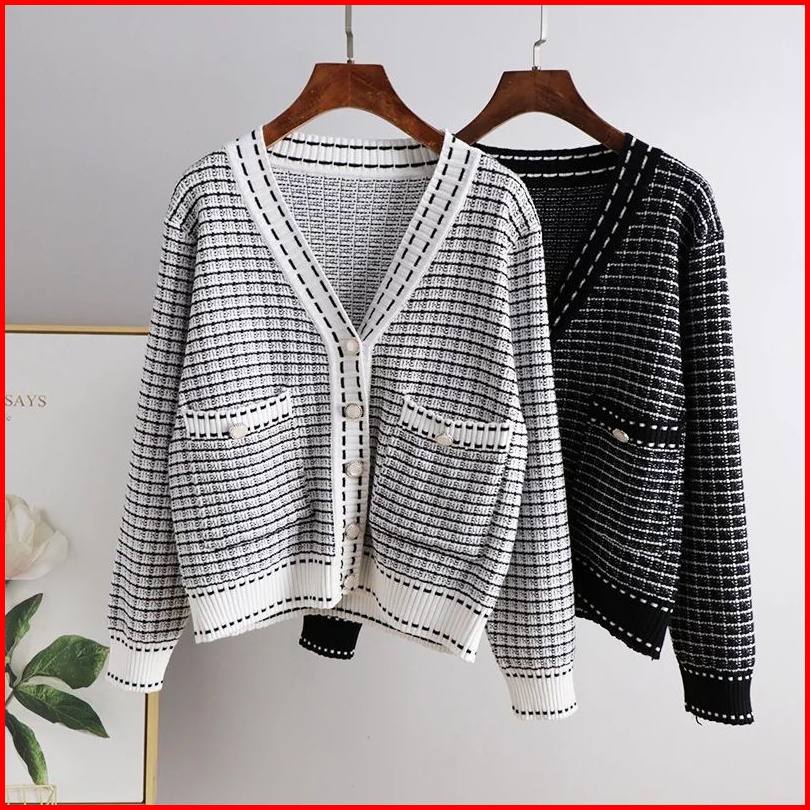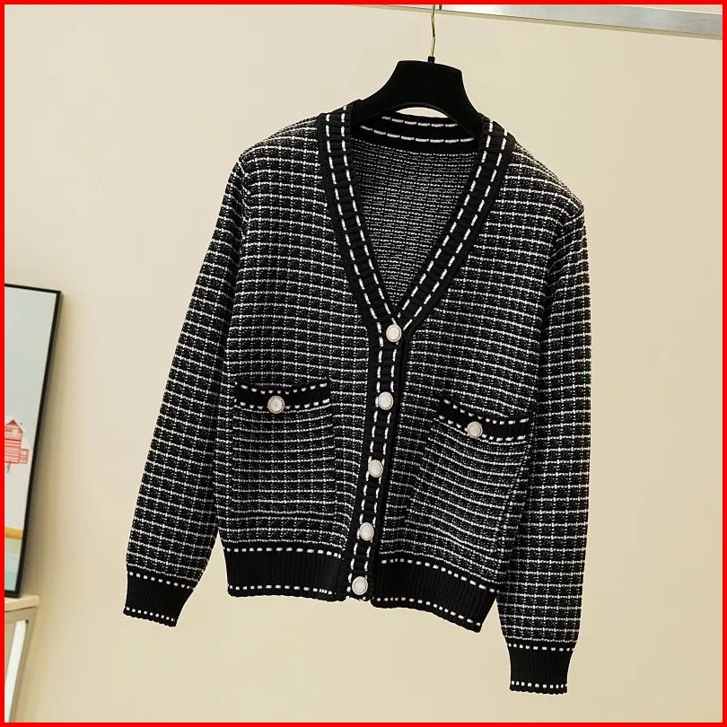 Cardigan Rajut Rubik V Neck Vintage Kotak-kotak