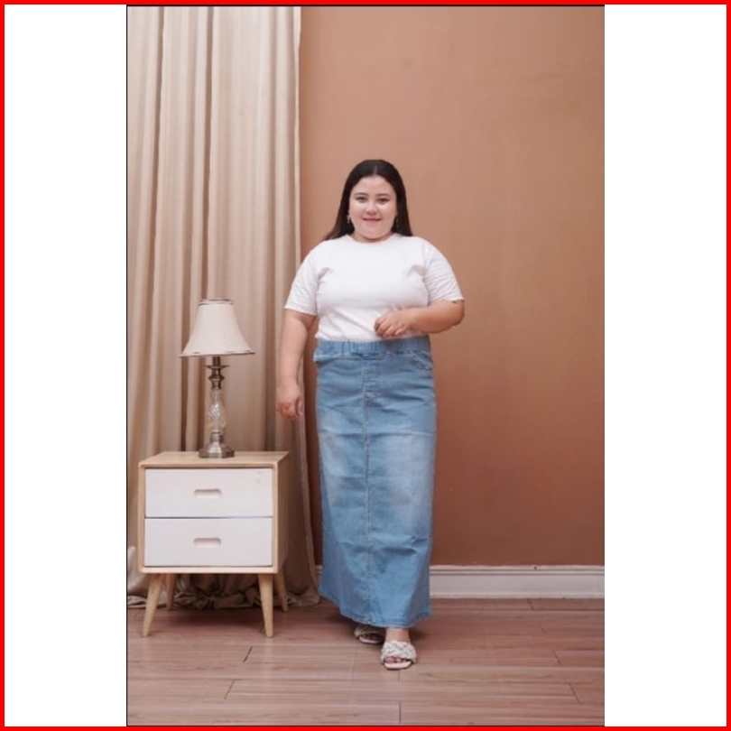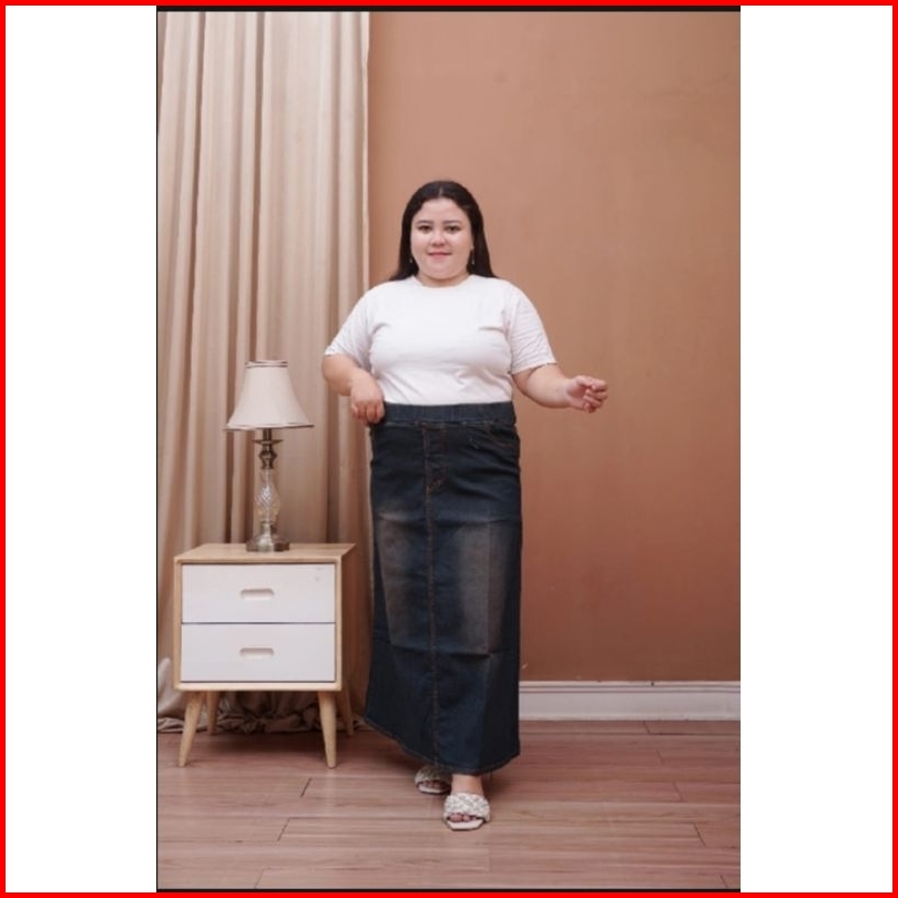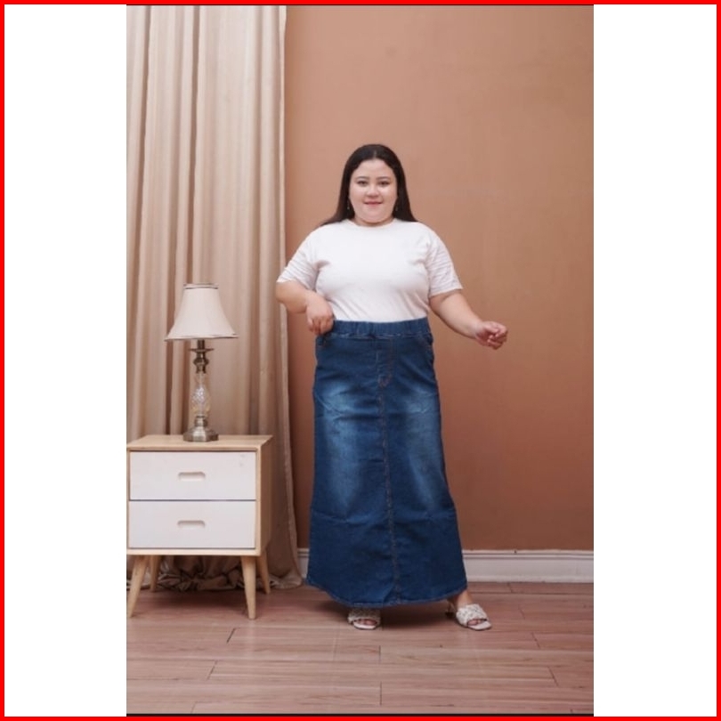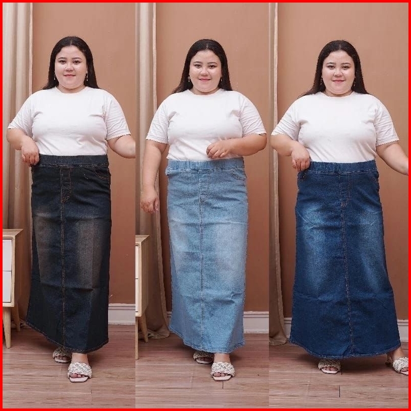 Rok Panjang Jumbo Jeans Rok Panjang Wanita Pinggang Karet Melar Rok A-line Panjang Jumbo Tebal
