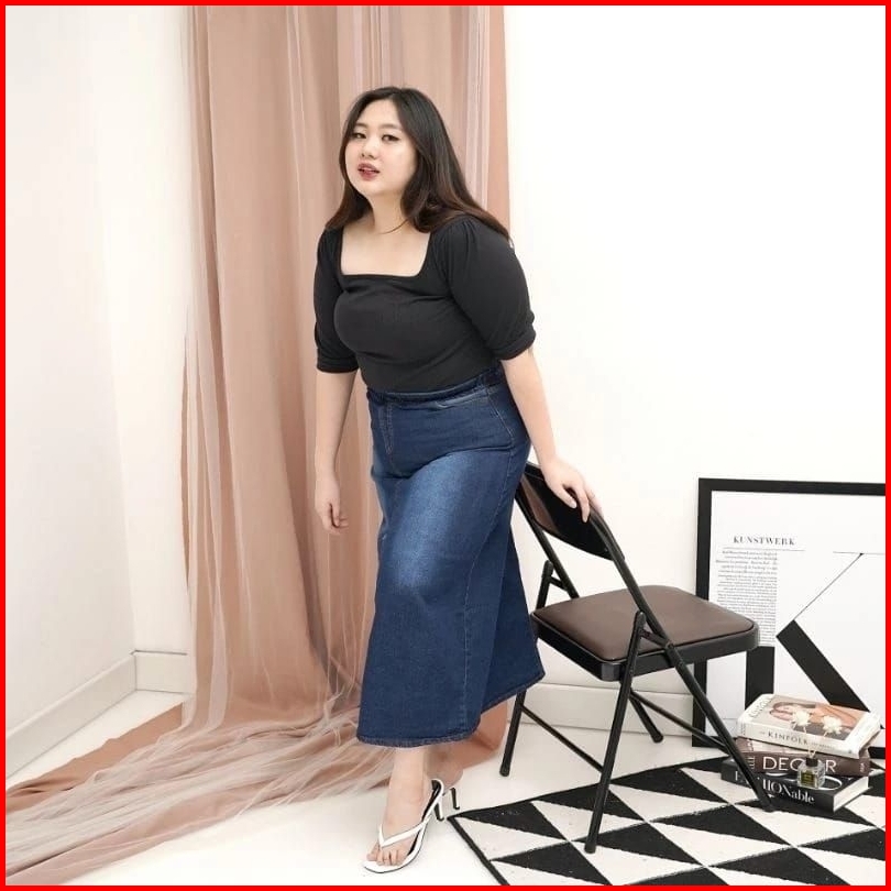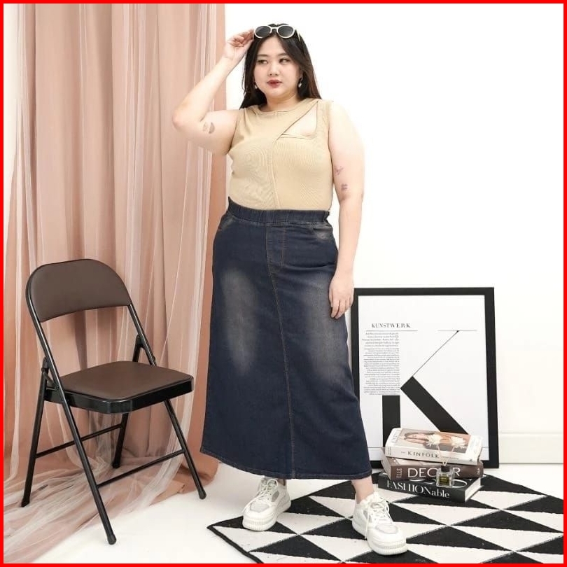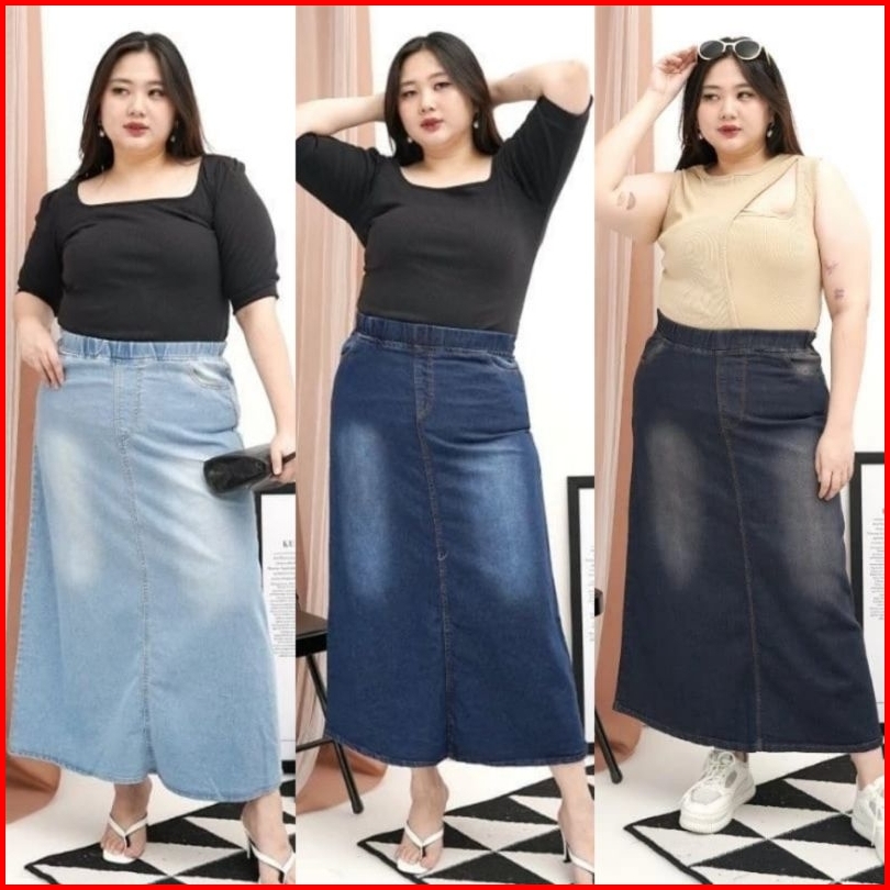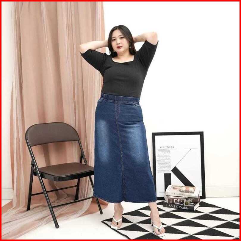 Rok Jeans Panjang Jumbo Wanita Rok Jeans Panjang Wanita Model A-line Rok Jeans Panjang Wanita Jumbo Full Karet Rok Denim