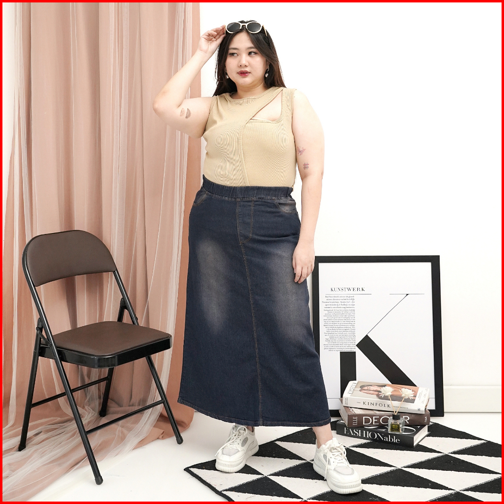 Rok Jeans Panjang Jumbo Rok Panjang Wanita Pinggang Full Karet Rok Span A-line Panjang Muat Bb 40-100kg