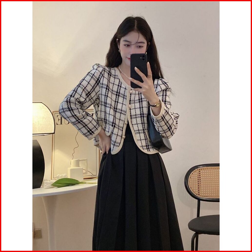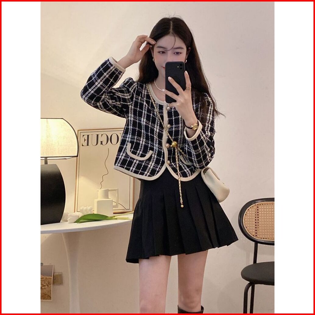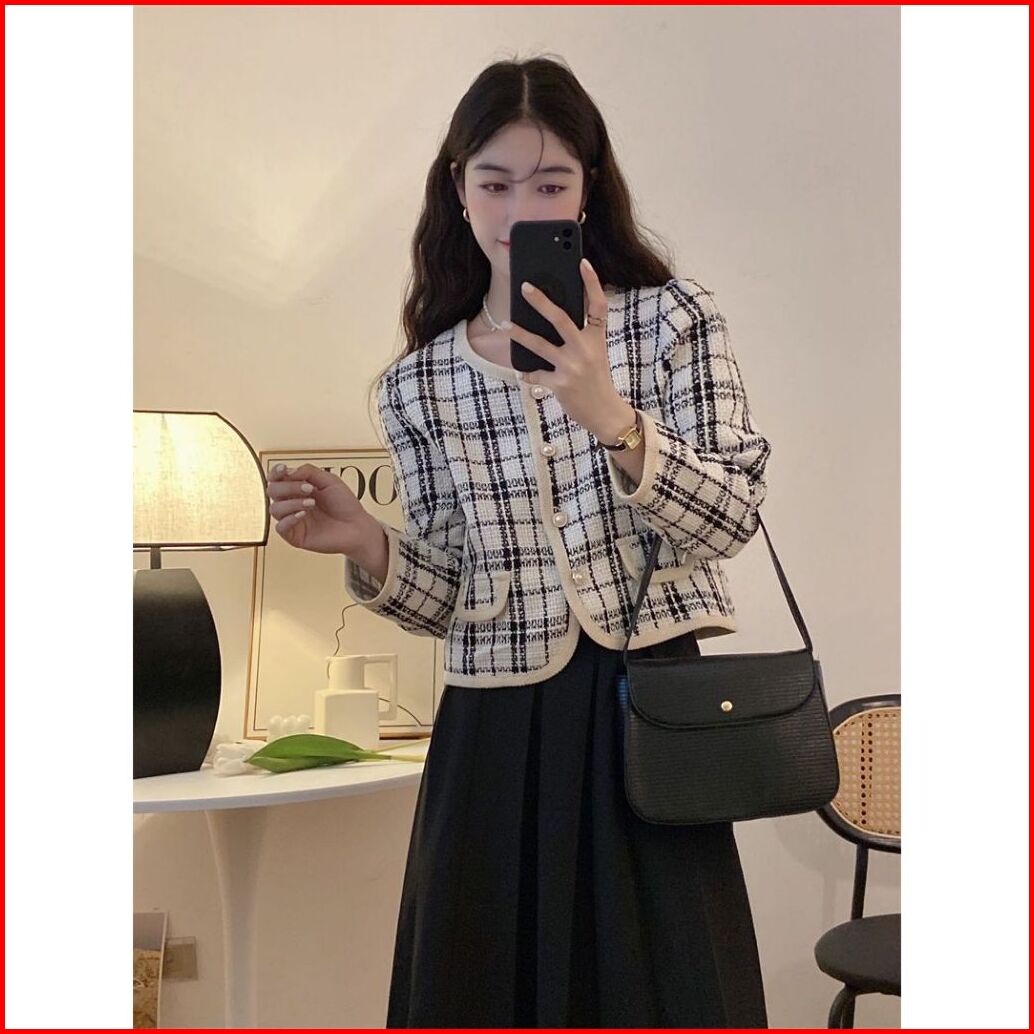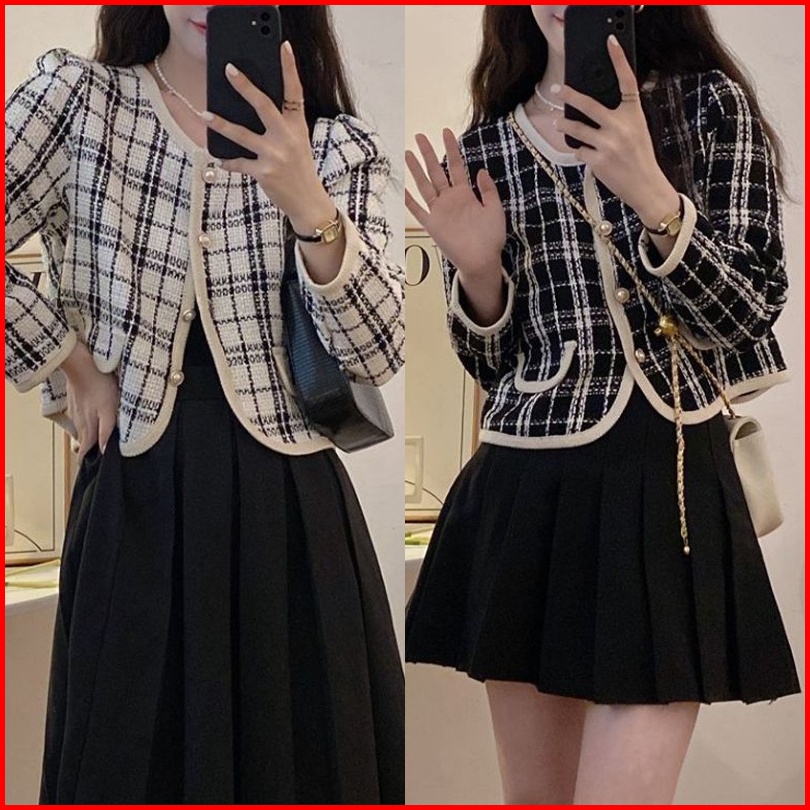 Jaket Kotak-kotak Wanita Gaya Korea Kekinian Import Jaket Kardigan Crop Terbaru Wanita Pendek Lengan Panjang Mutiara Kor