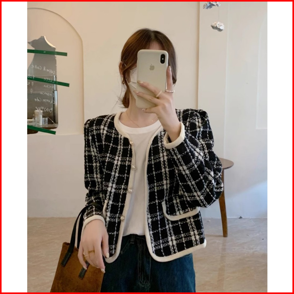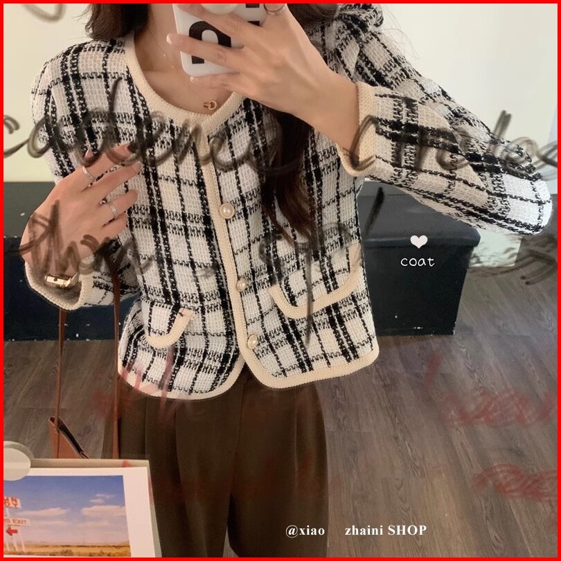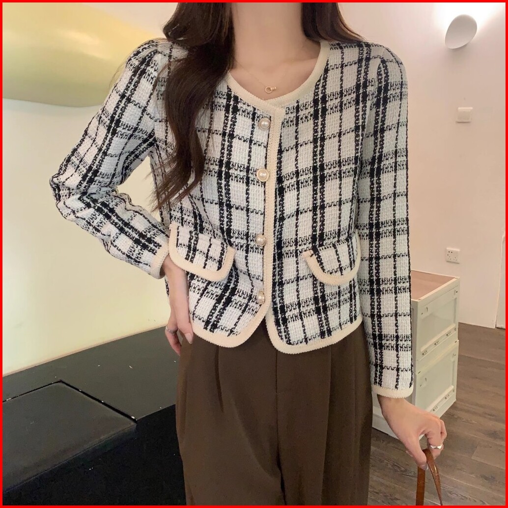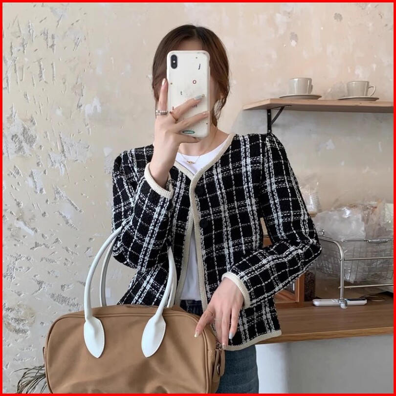 Jaket Wanita Korean Style Lengan Panjang Kekinian Kotak-kotak Kardigan Crop Vintage Baju Atasan Wanita Tweed Outer Terba