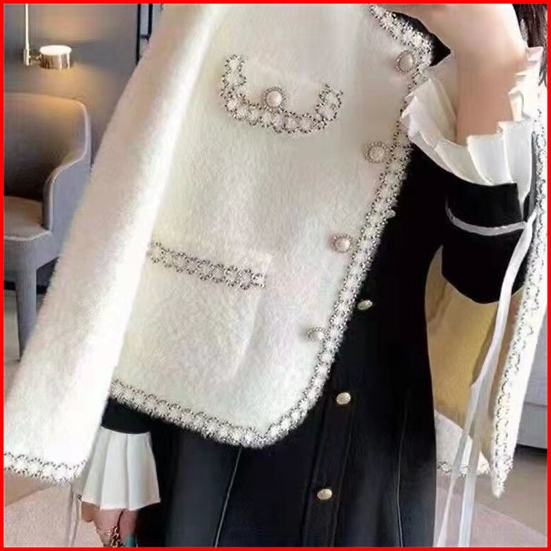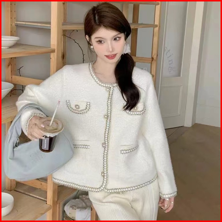 Ekouaer Cardigan Wol Rajut Korean Style Lis Full Mutiara