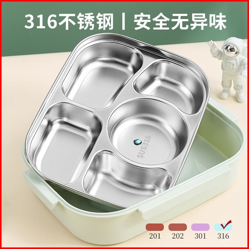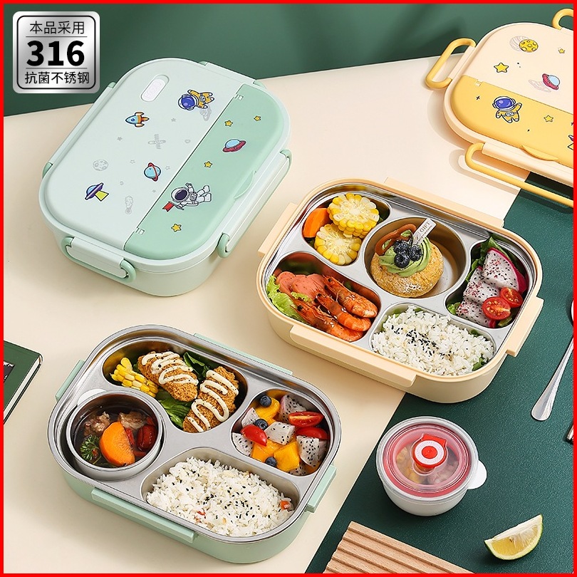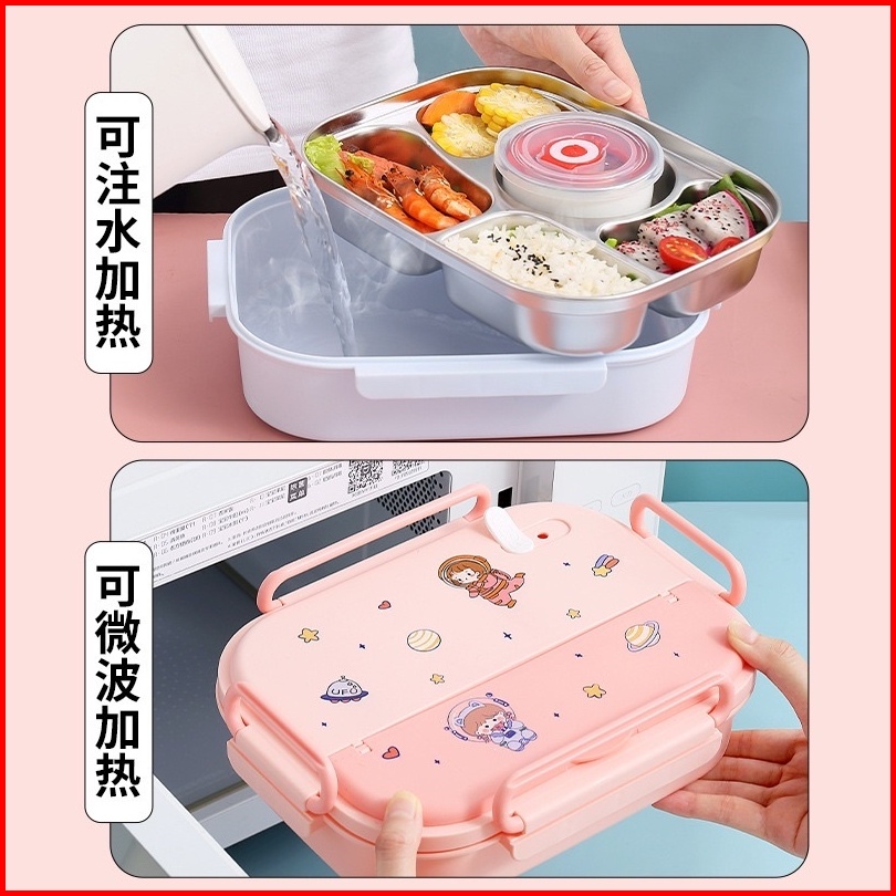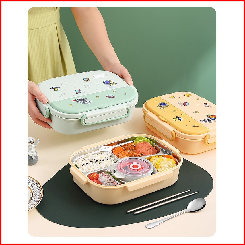 Kotak Makan Anak Lunch Box Stainless Tahan Panas 4 Sekat Dan 5 Sekat Anti Tumpah Dgn Sendok Sumpit
