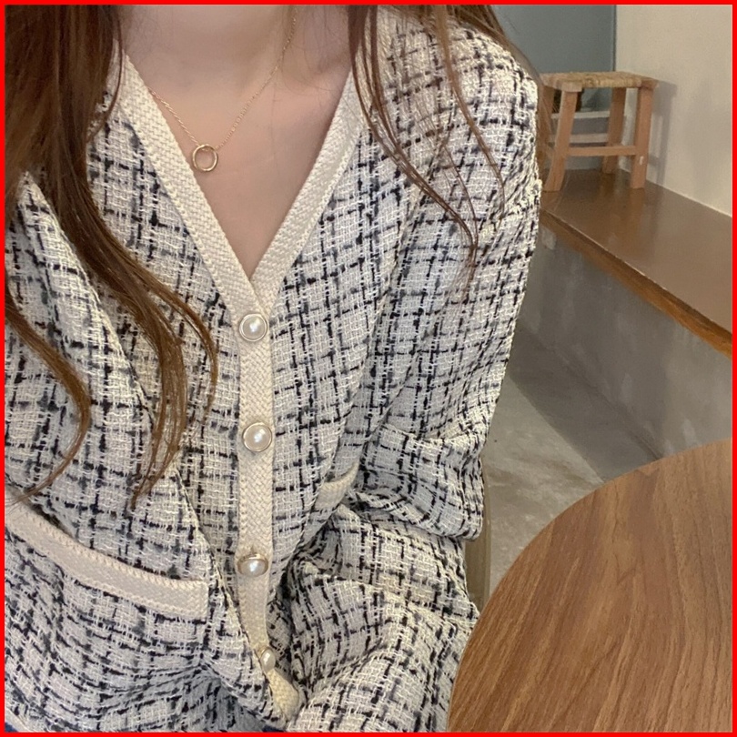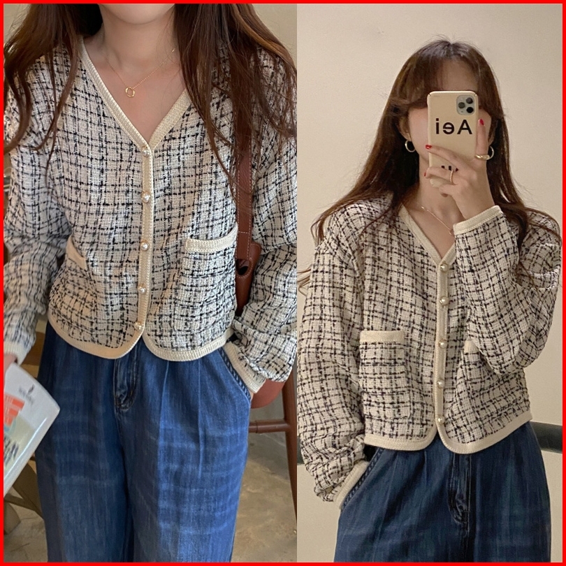 Jaket Pendek V-neck Korea Style Kardigan Kotak-kotak Wanita