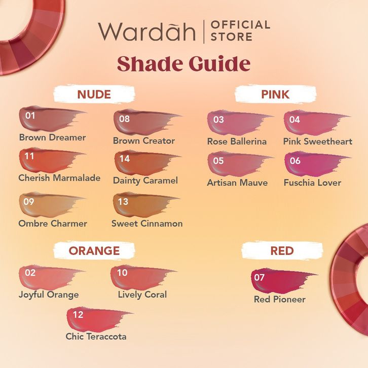 01 Brown Dreamer, 02 Joyful Orange, 03 Rose Ballerina, 04 Pink Sweetheart, 05 Artisan Mauve, 06 Fuchsia Lover, 07 Red Pionner, 08 Brown Creator, 09 Ombre Charmer, 10 Lively Coral, 11 Cherish Marmalade, 12 Chic Terracotta, 13 Sweet Cinnamon, 14 Dainty Caramel, 15. Tranquil Hazel, 16. Rouge Passion, 17. Beyond Sunset, 18. Serene Sienna, 19. Peony Bliss, 20. Rosy Bloom, 21. Magnetic Red, 22. Poise Plum