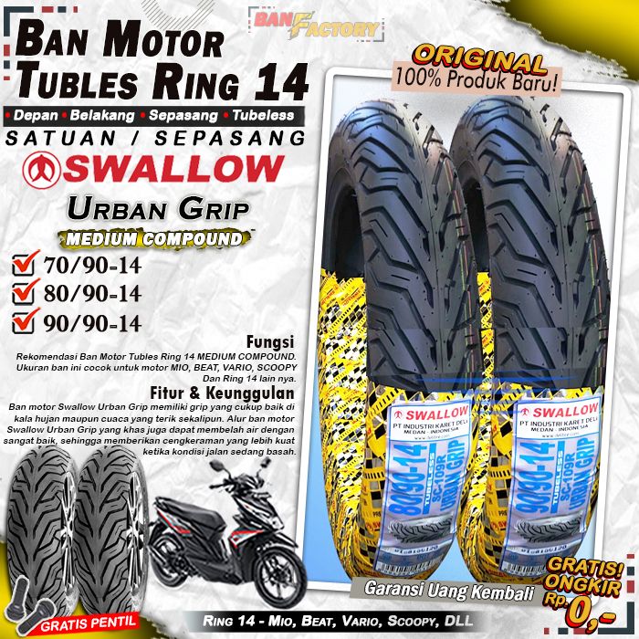 BAN MOTOR MATIC TUBLES SWALLOW RING 14 BAN DEPAN BELAKANG BEAT VARIO SCOOPY BAN SWALLOW URBAN GRIP RING 14 TUBELESS