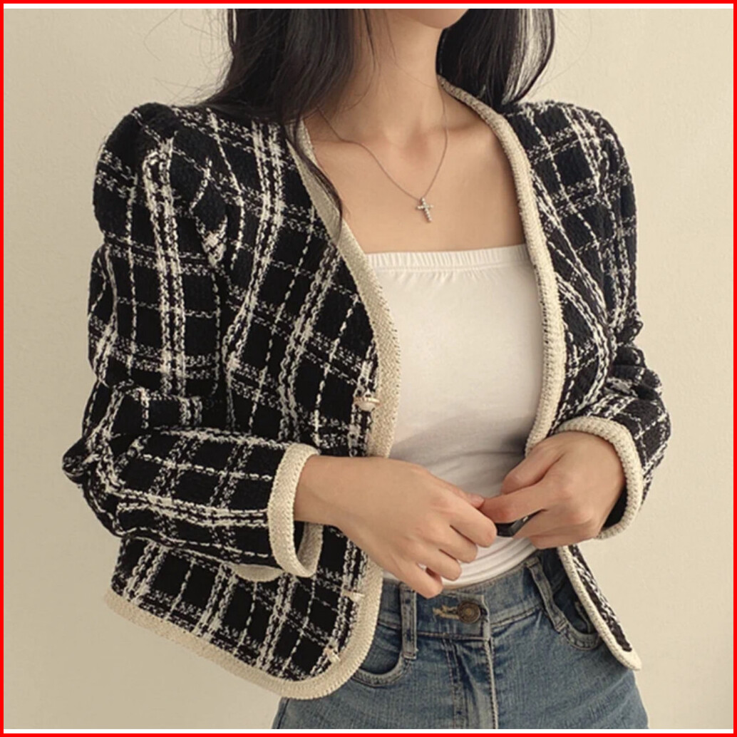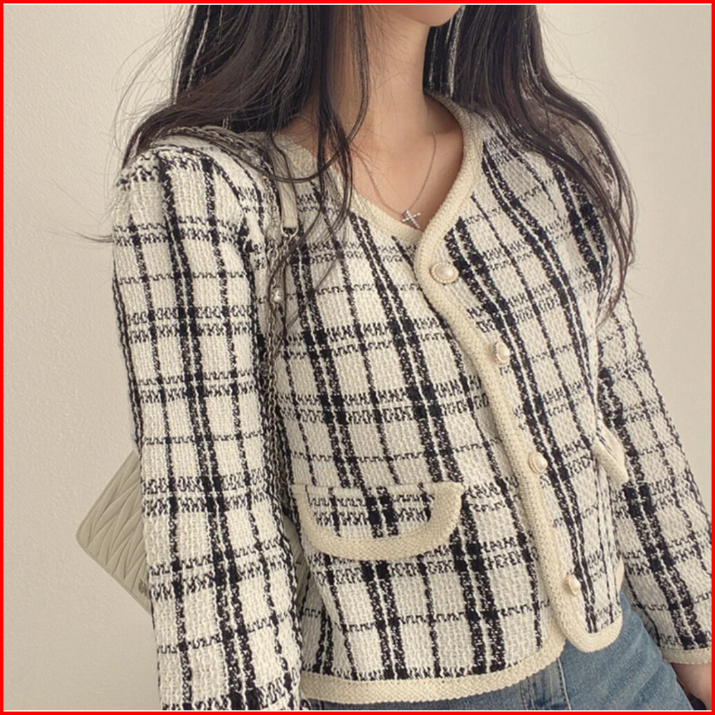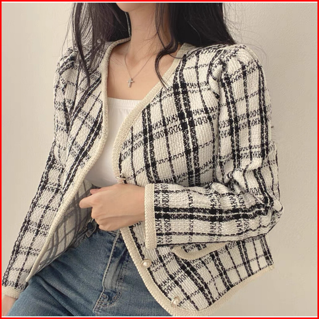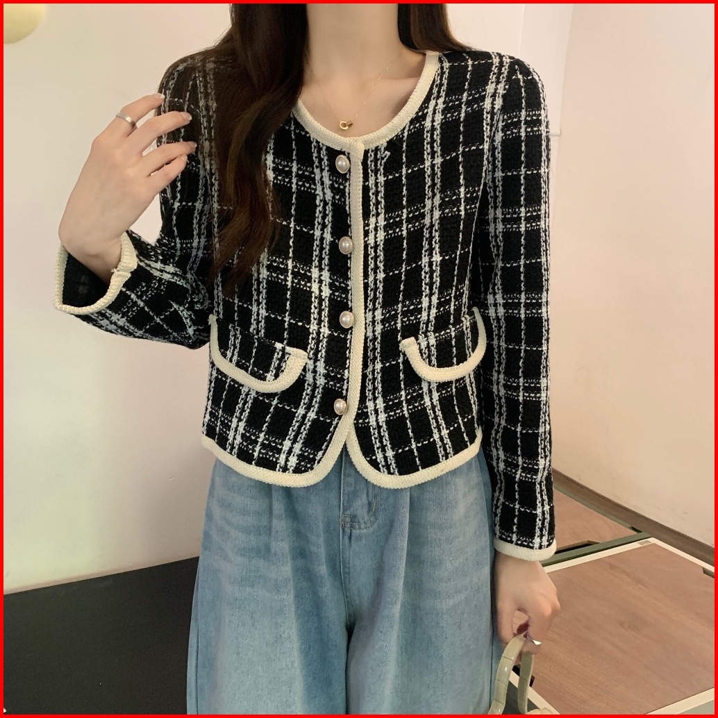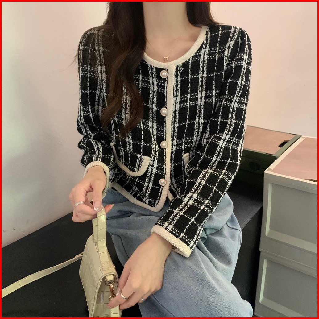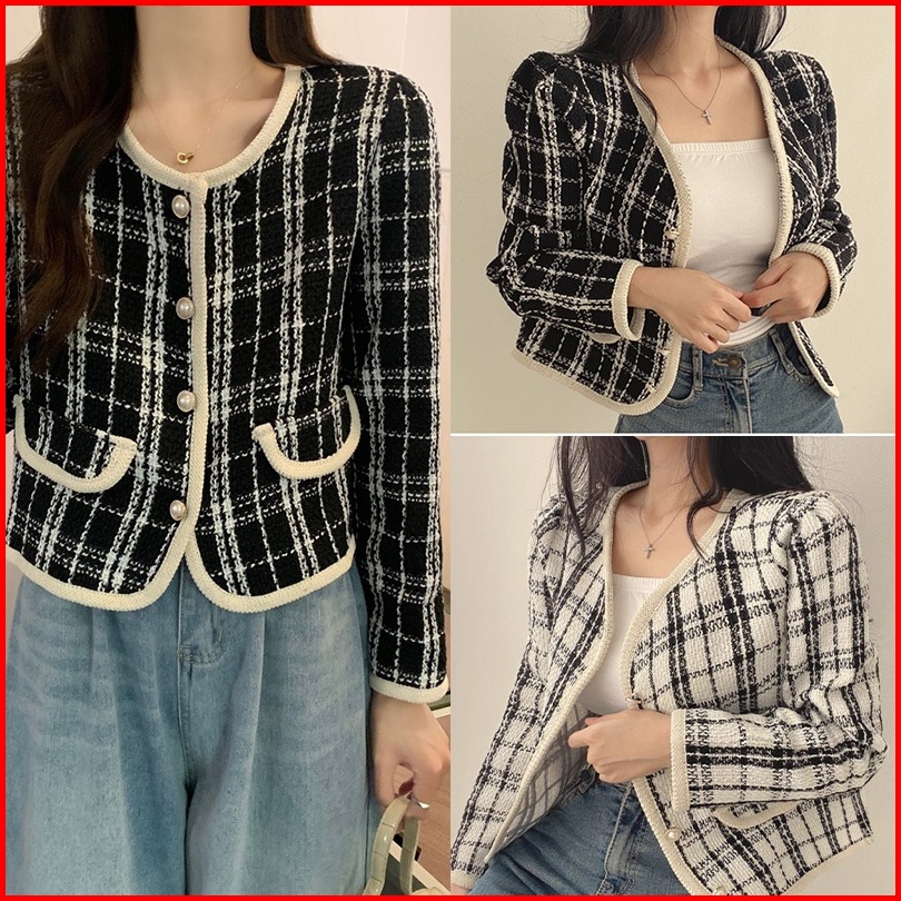 Jaket Kotak-kotak Wanita Gaya Korea Atasan Kardigan Pendek Lengan Panjang Mutiara Jaket Wanita Korean Style Kekinian Imp