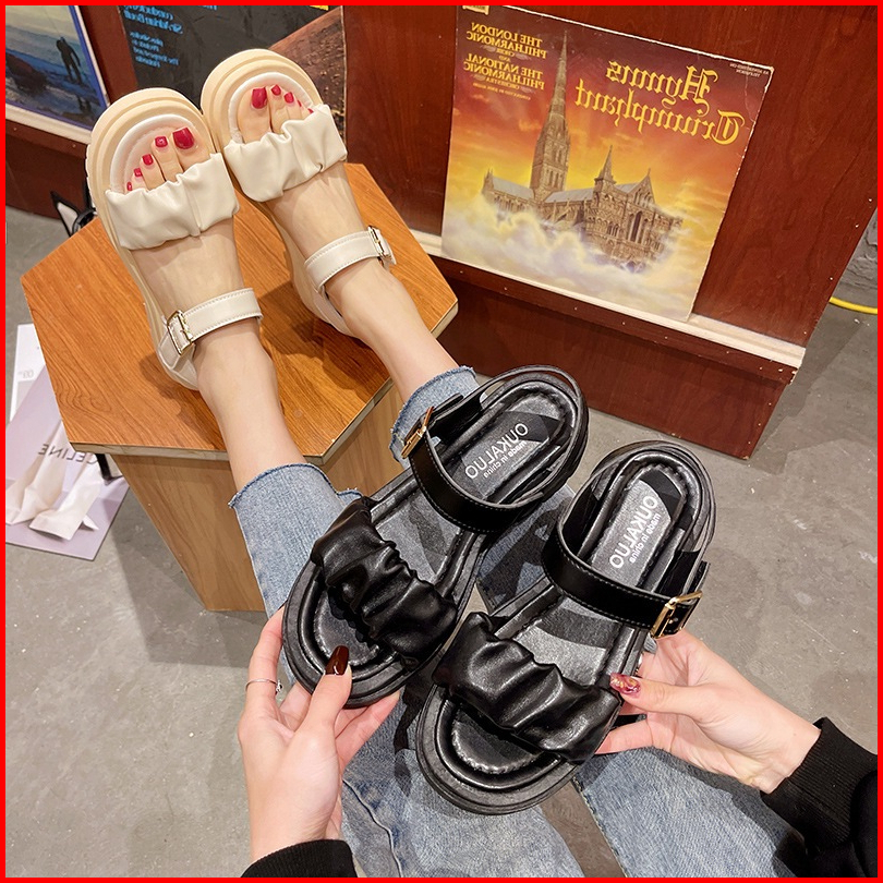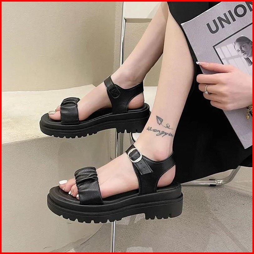 Sandal Tali Wanita Korea Hak Tinggi Hitam Polos Fashion Import Ruffle Ms89