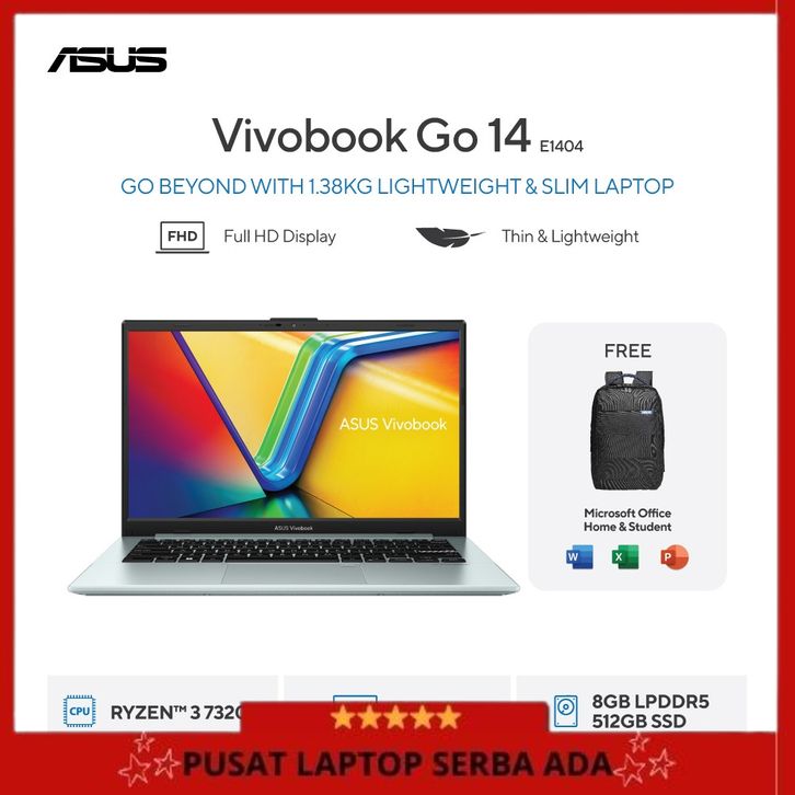 ASUS LAPTOP VIVOBOOK GO 14 E1404FA RYZEN 3 7320U 8GB 256GB/512GB W11+OHS 14.0 FHD BLK MURAH BERKUALITAS TANPA DP BARU