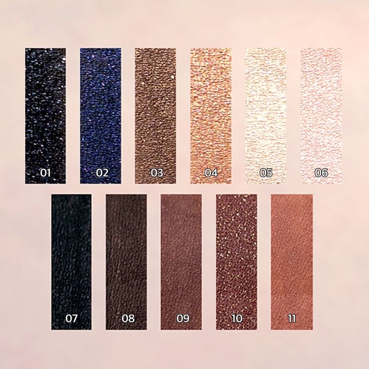 01_MIDNIGHT BLACK, 01_Weekday(03+08+09), 02_CHIC NAVY, 02_GLOW(04+06+10), 03_CINNAMON MOCHA, 03_Mellow(03+04+05), 04_GLAM LATTE, 05_CHAMPAGNE 9OLD, 06_BABY PEACH, 07_MATT BLACK, 08_MATT BROWN, 09_CHOCO BROWN, 10_DARK ROSE