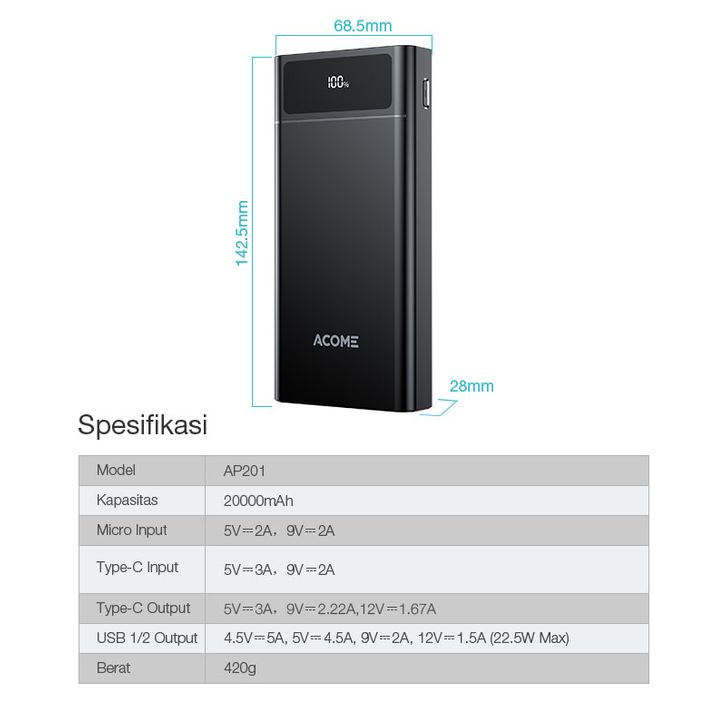 ACOME AP201 20000MAH LED DISPLAY DUAL INPUT POWERBANK ACOME ORIGINAL POWER BANK 20000MAH POWER BANK ACOME FAST CHARGING