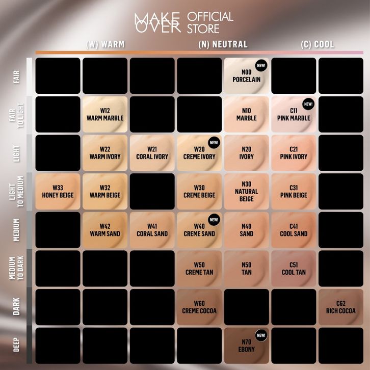 C21 Pink Ivory, C31 Pink Beige, C41 Cool Sand, C51 Cool Tan, C62 Rich Cocoa, N10 Marble, N20 Ivory, N30 Natural Beige, N40 Sand, N50 Tan, NEW! C11 Pink marble, NEW! N00 Porcelain, NEW! N70 Ebony, NEW! W20 Creme Ivory, NEW! W40 Creme Sand, W12 Warm Marble, W21 Coral Ivory, W22 Warm Ivory, W30 Creme Beige, W32 Warm Beige, W33 Honey Beige, W41 Coral Sand, W42 Warm Sand, W50 Creme Tan, W60 Creme Cocoa