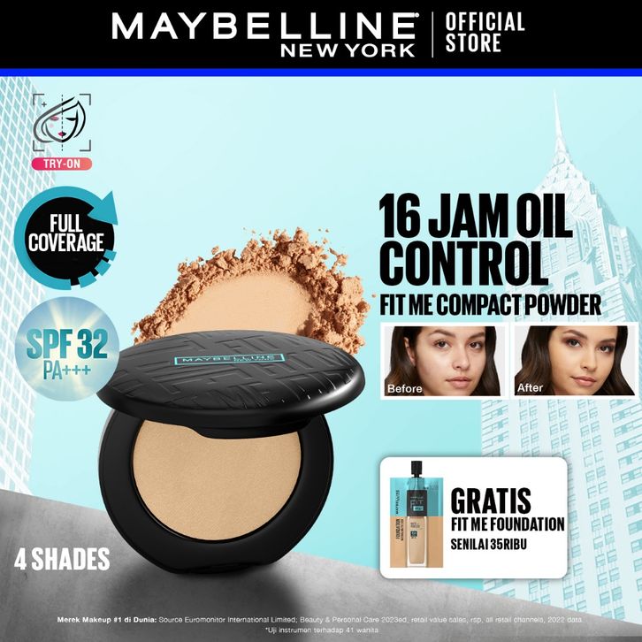 MAYBELLINE OFFICIAL Fit Me Matte + Poreless 16 Jam Oil Control Compact Powder Make Up Bedak Padat bebas minyak tahan 16