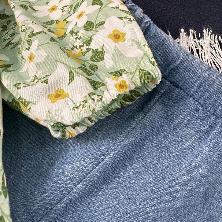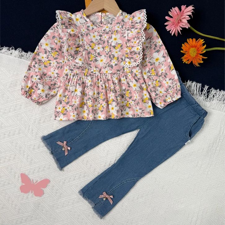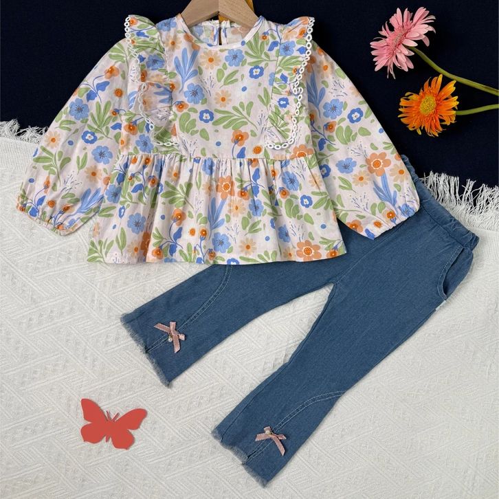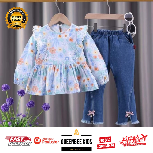 Setelan Baju Anak Perempuan Lengan Panjang Katun Jeans Motif Bunga Casual Style Usia 1-4 Tahun