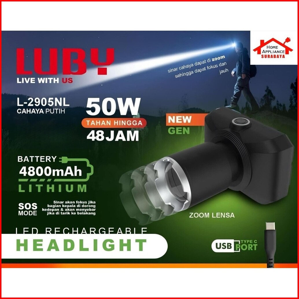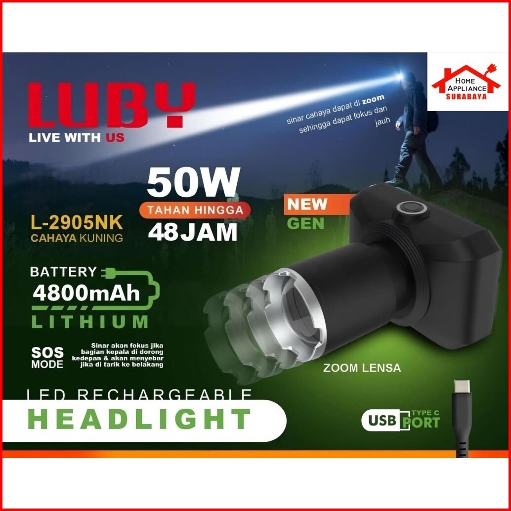 Luby Headlamp Senter Kepala Led Zoom 50w - 50 Watt 4800mah L-2905nl L-2905nk Cahaya Putih - Kuning L 2905 Nl Nk Tahan 48