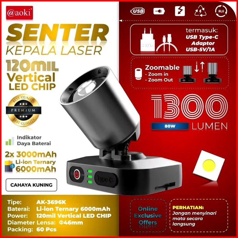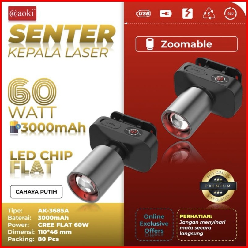 Aoki Senter Kepala Led Zoom 60wat Ak-3685a Ak 3685k Ak3676 1000lm Pro Putih