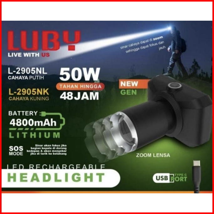 Senter Kepala Luby Led Zoom L-2905nl 50 Watt Cahaya Putih Garansi Resmi