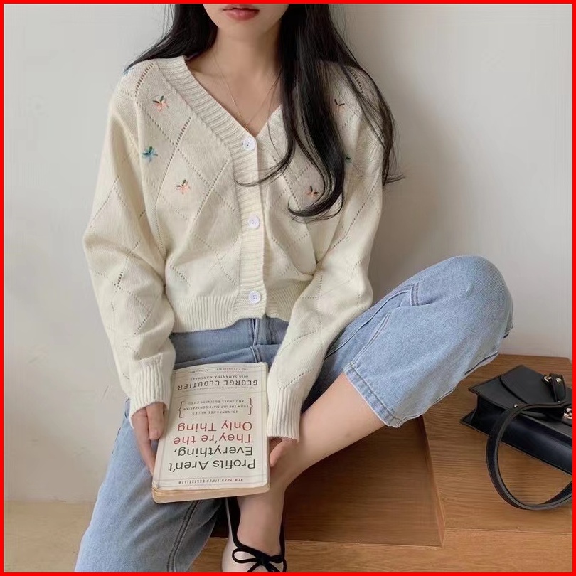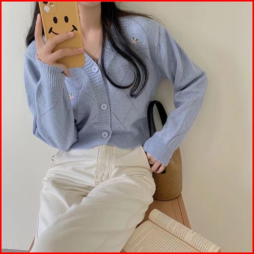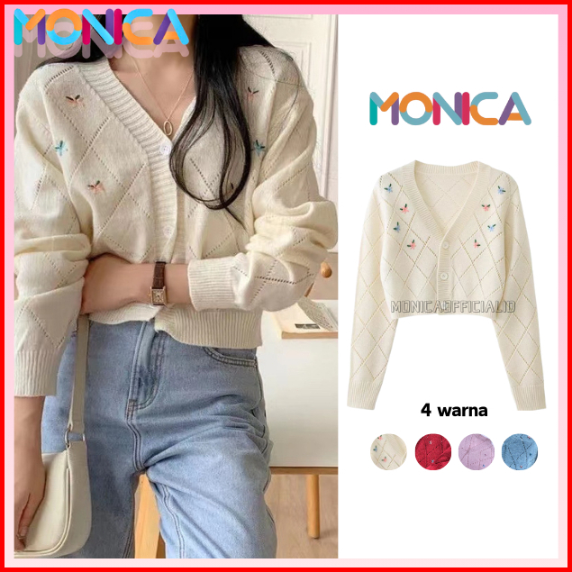 Monica Cardigan Rajut Blossom Motif Bunga Import Cardigan Korean Style Crop Pink Merah Biru Putih