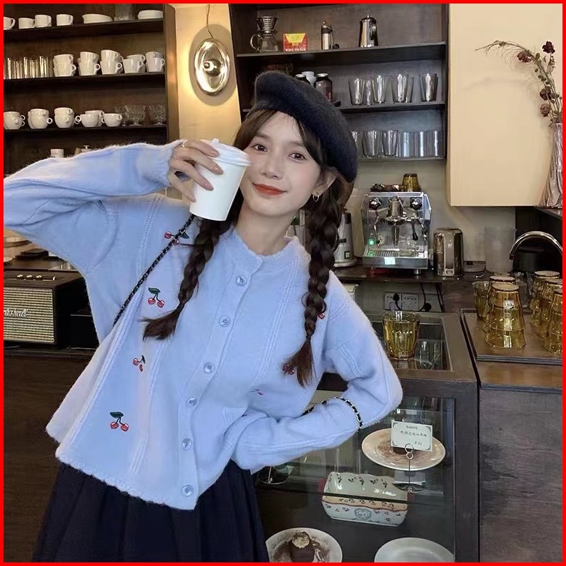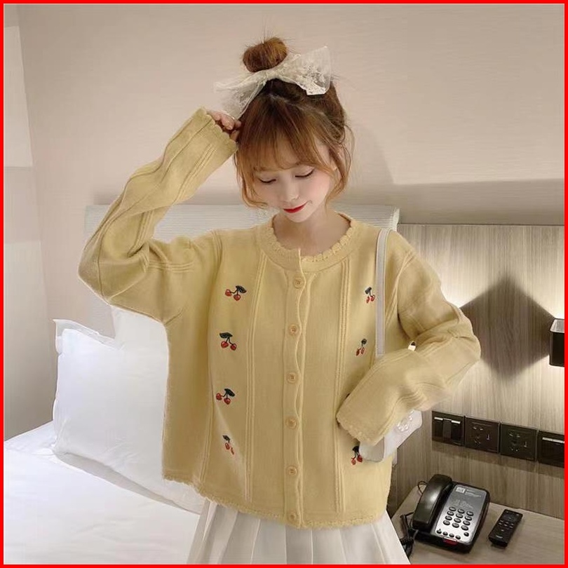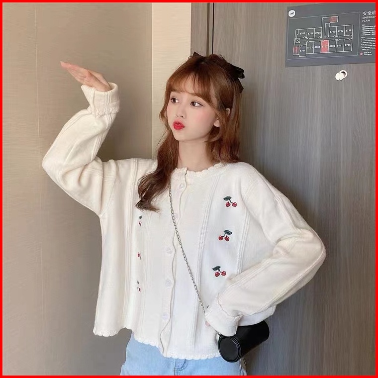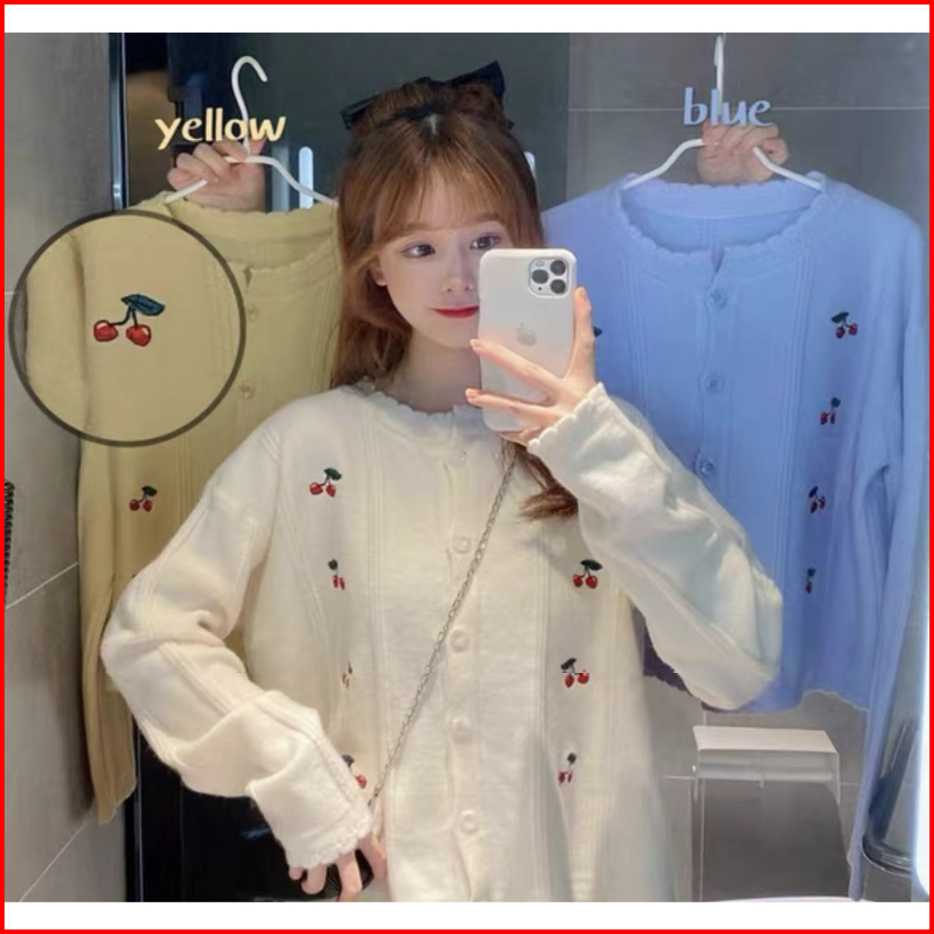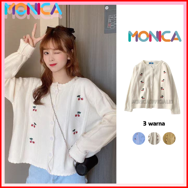Monica Berry Cardigan Busana Kasual Cherry Cardigan Knit Cardigan Rajut Wanita Putih Biru Kuning