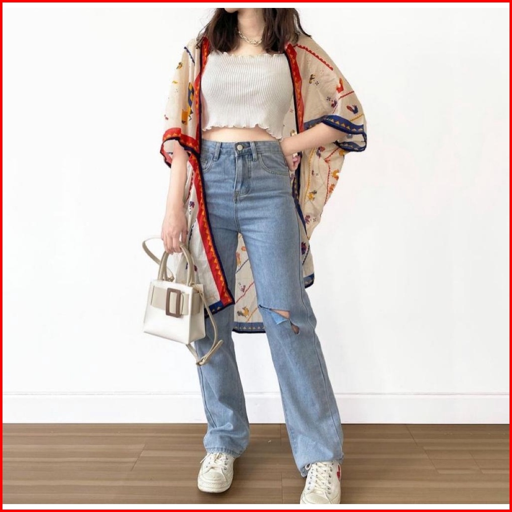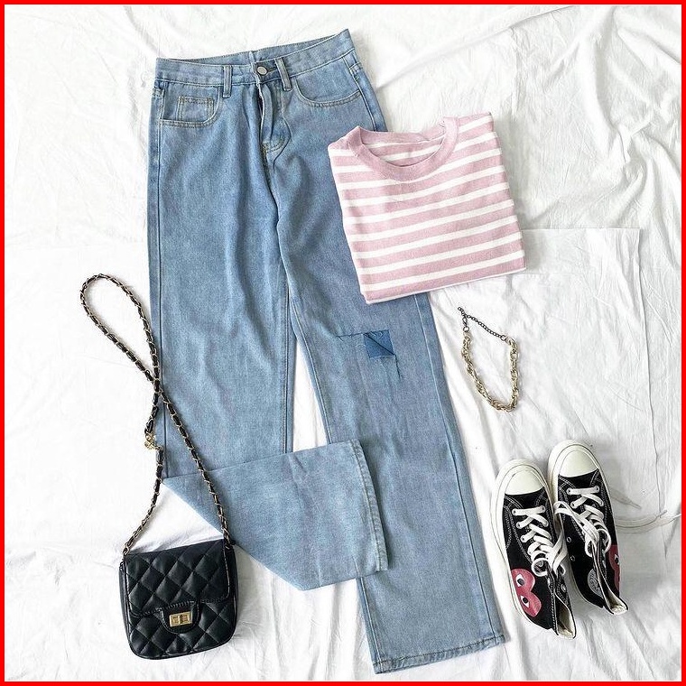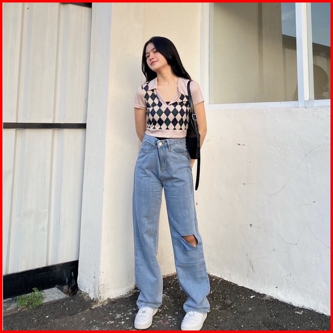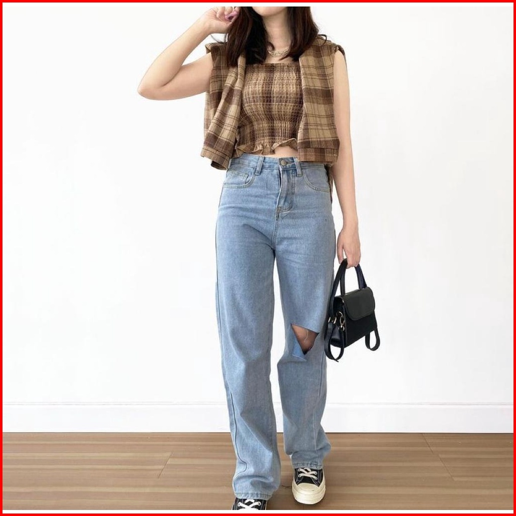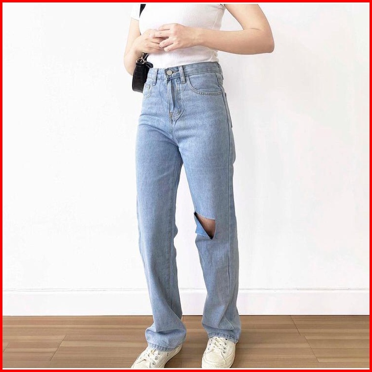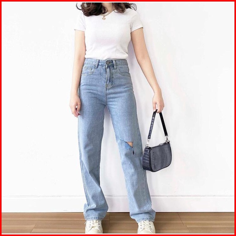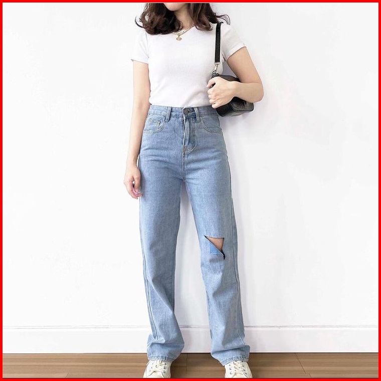 T63 18town Korean Ripped Jeans Celana Jeans Panjang Model Longgar Ripped High Waist Gaya Korea Murah Dan Nyaman