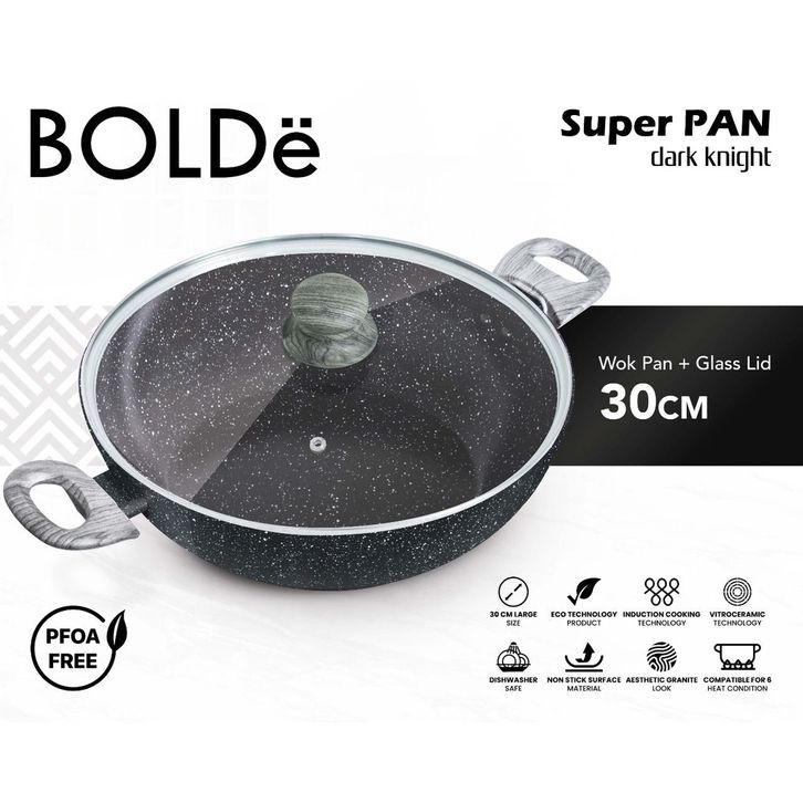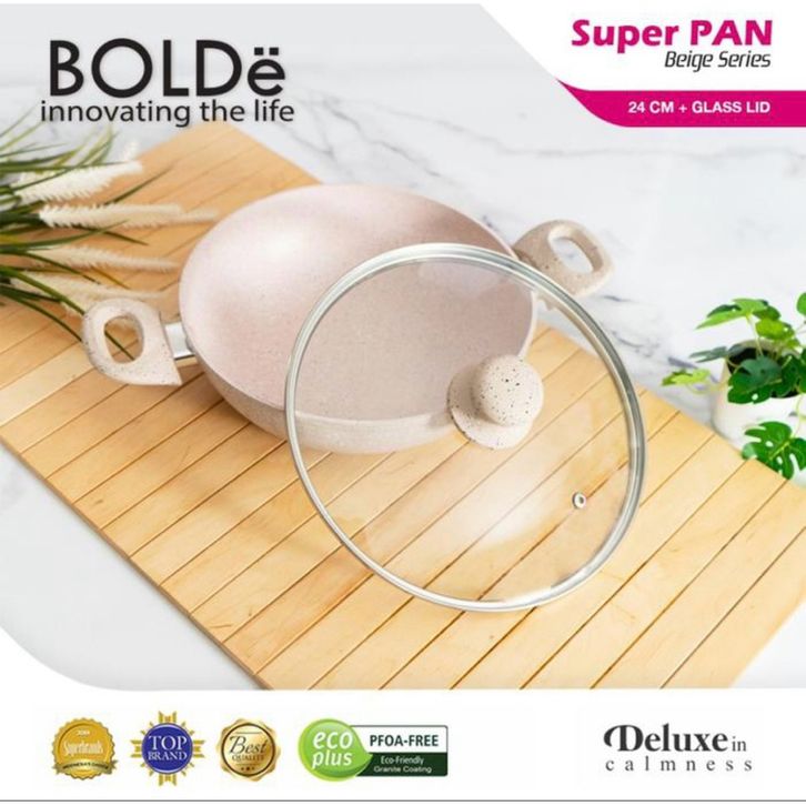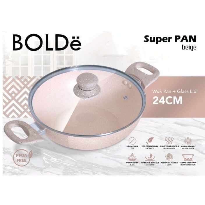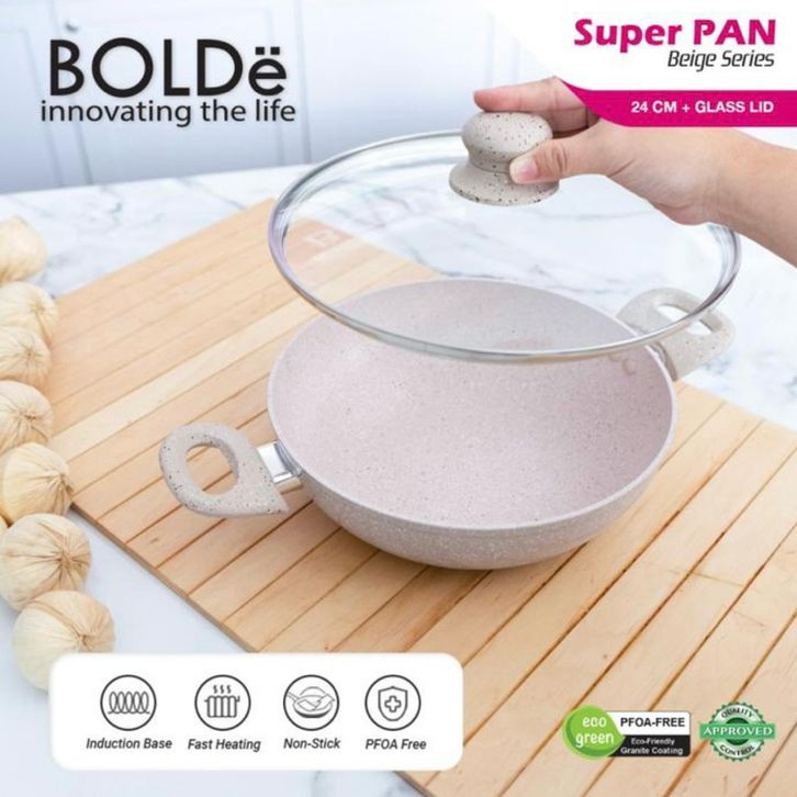 Wajan Anti lengket Panci Bolde Super Pan 2 Ear Wok Pan Wajan Kuali 24 Cm Beige + Glass Lid Original Termurah