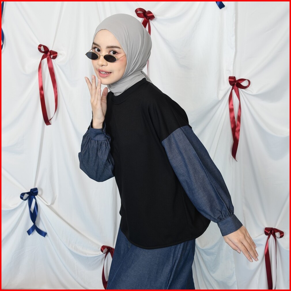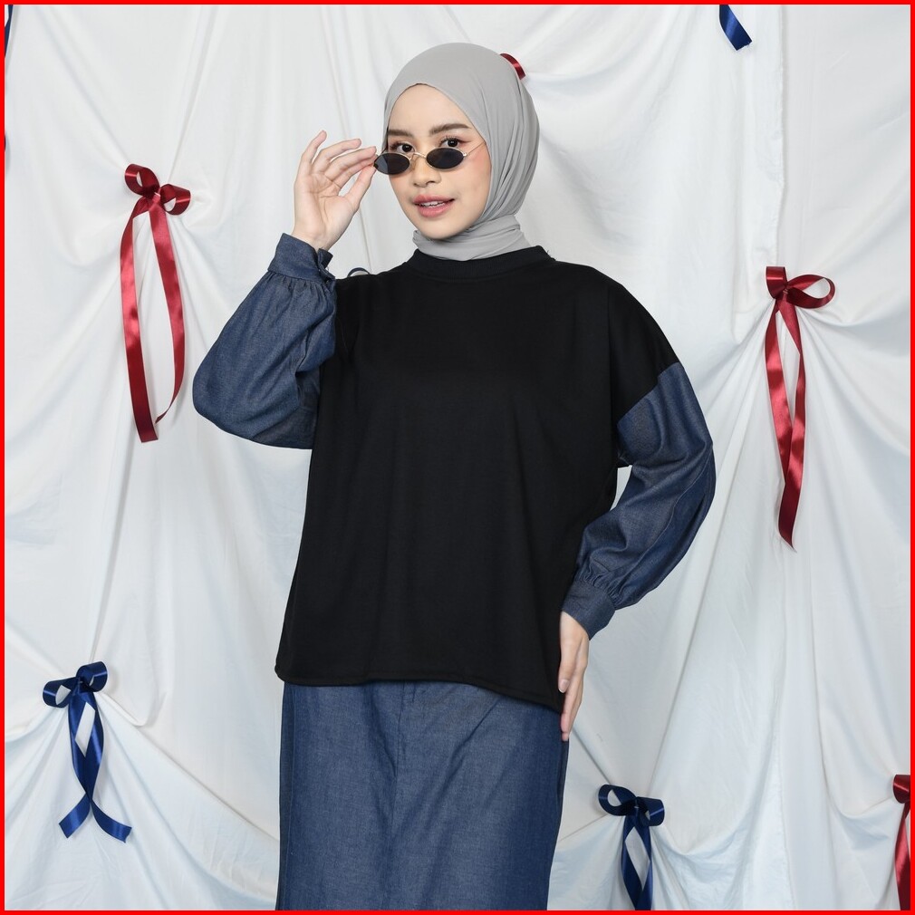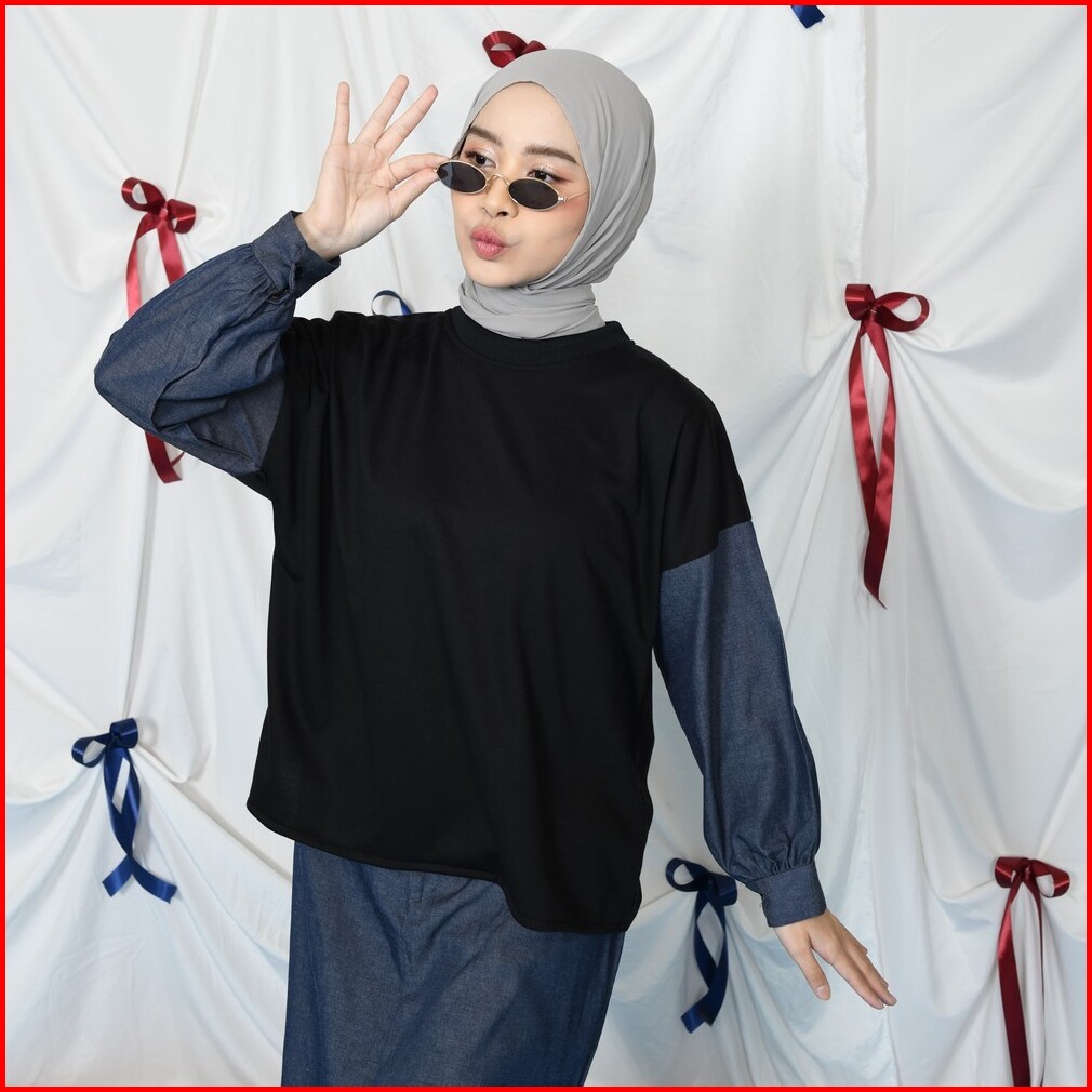 Mybamus Fadia Terry Top Mix Denim Atasan Wanita Oversize Lengan Panjang Kombinasi