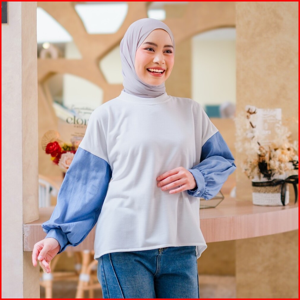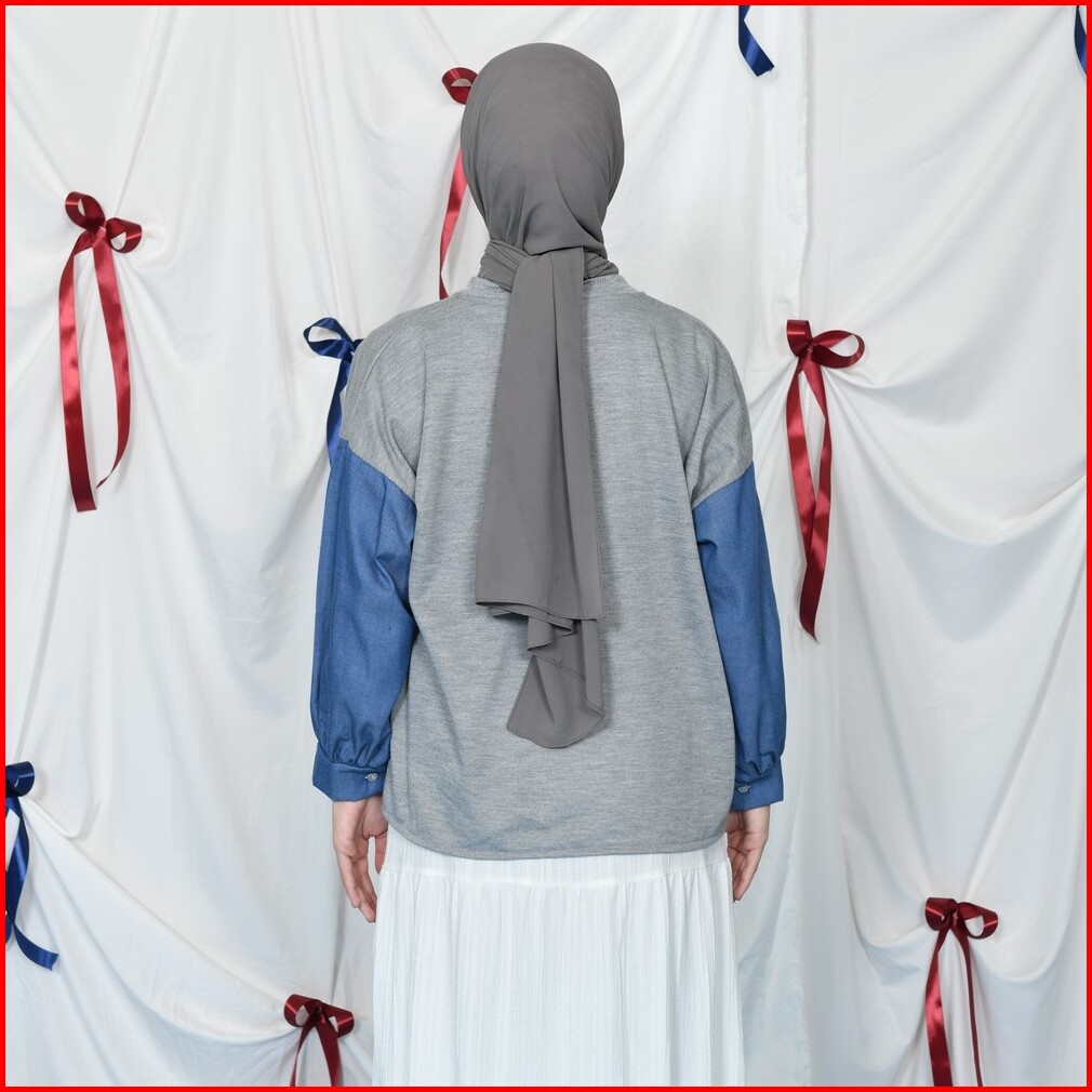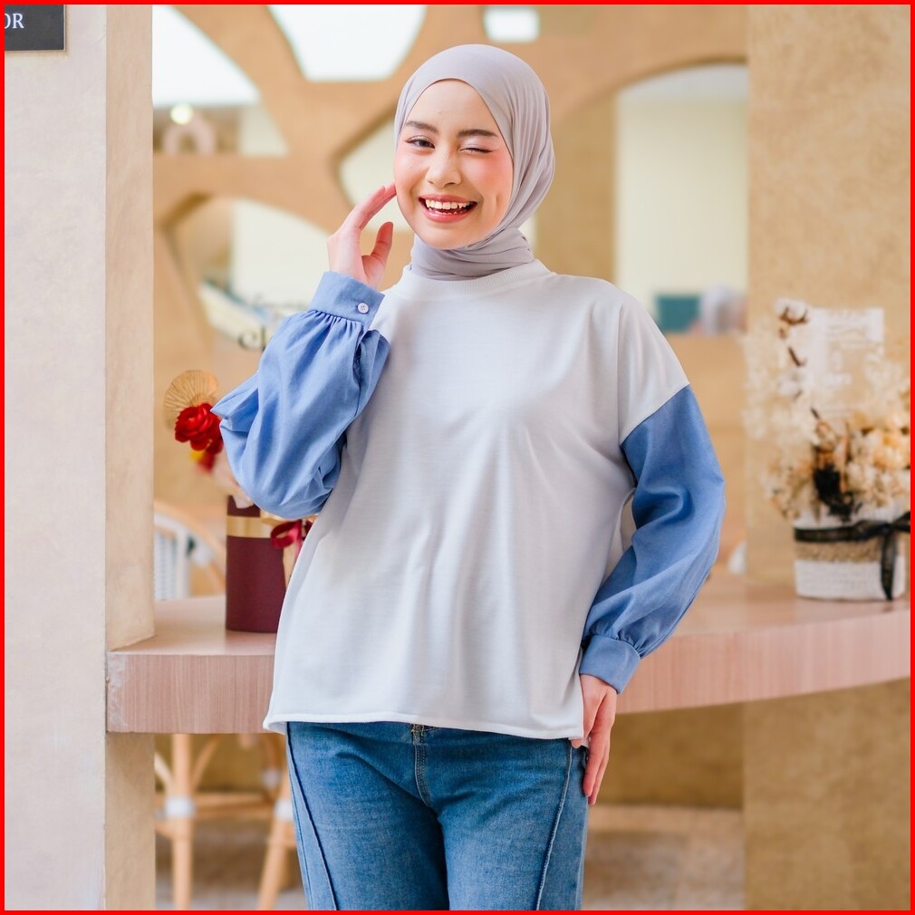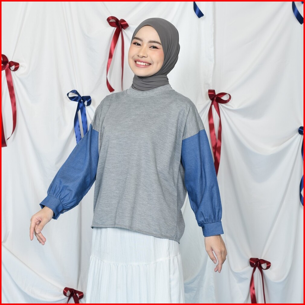 Mybamus Fadia Terry Top Mix Denim Atasan Wanita Oversize Lengan Panjang Kombinasi