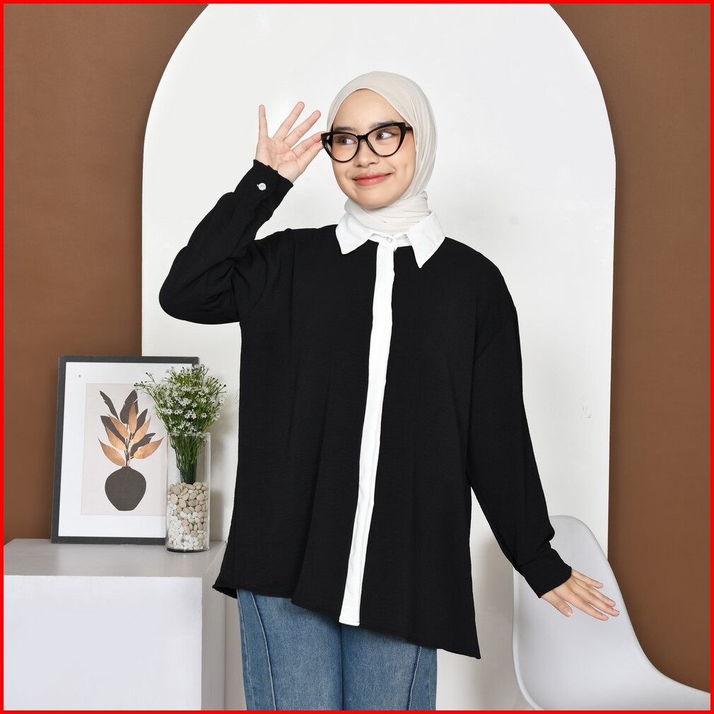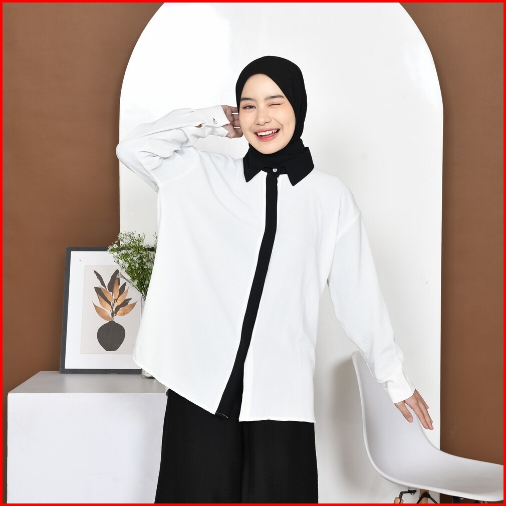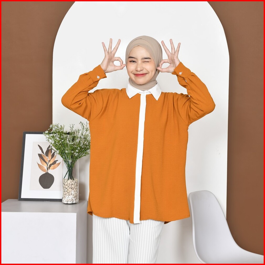 Mybamus Cia Kemeja List Kemeja Wanita Color Block Atasan Tangan Panjang Kemeja Kerja Wanita