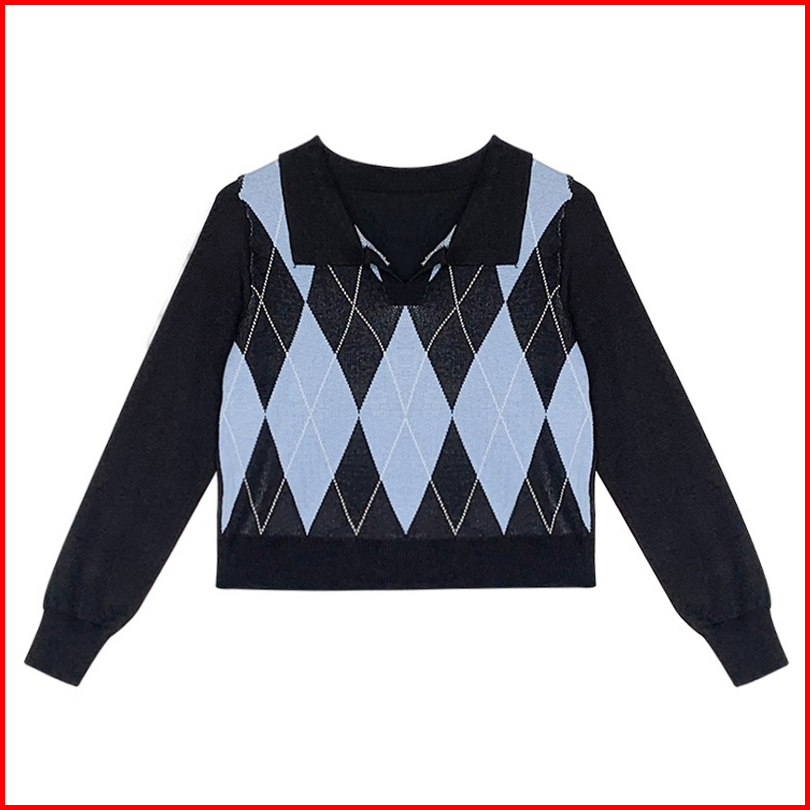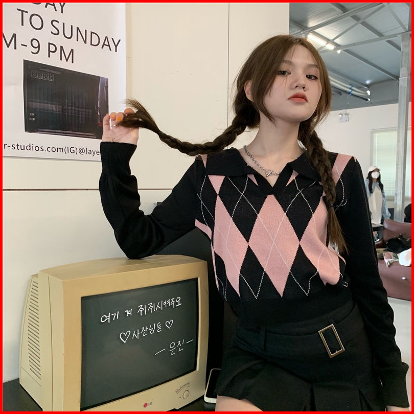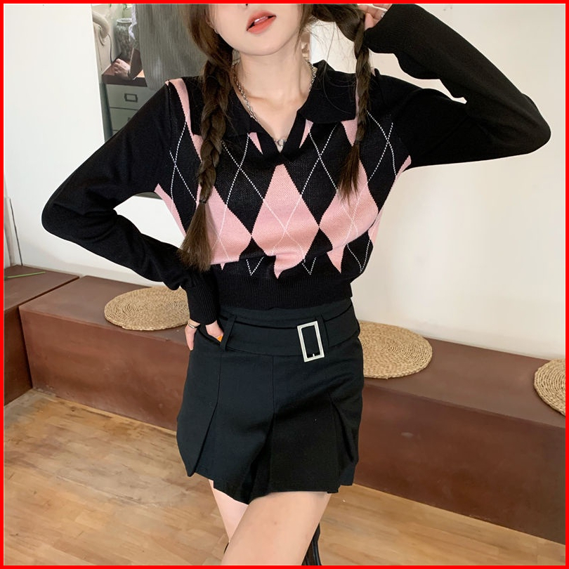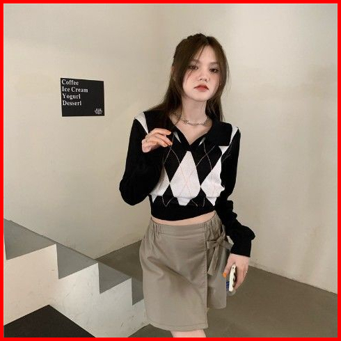 Polo Shirt Sweater Rajut Crop Top Wanita Lengan Panjang Korean Style