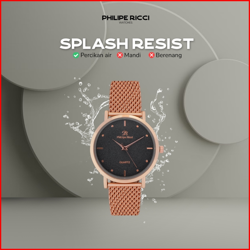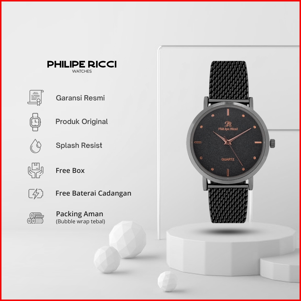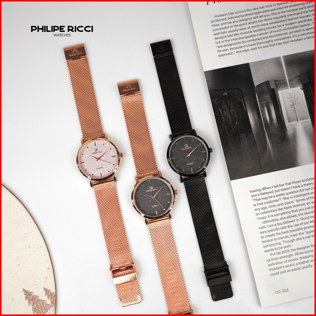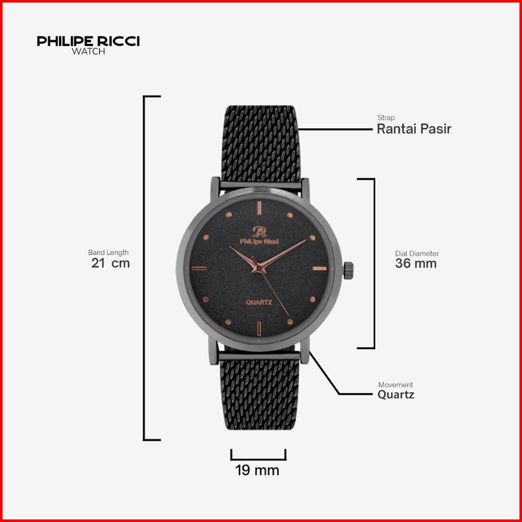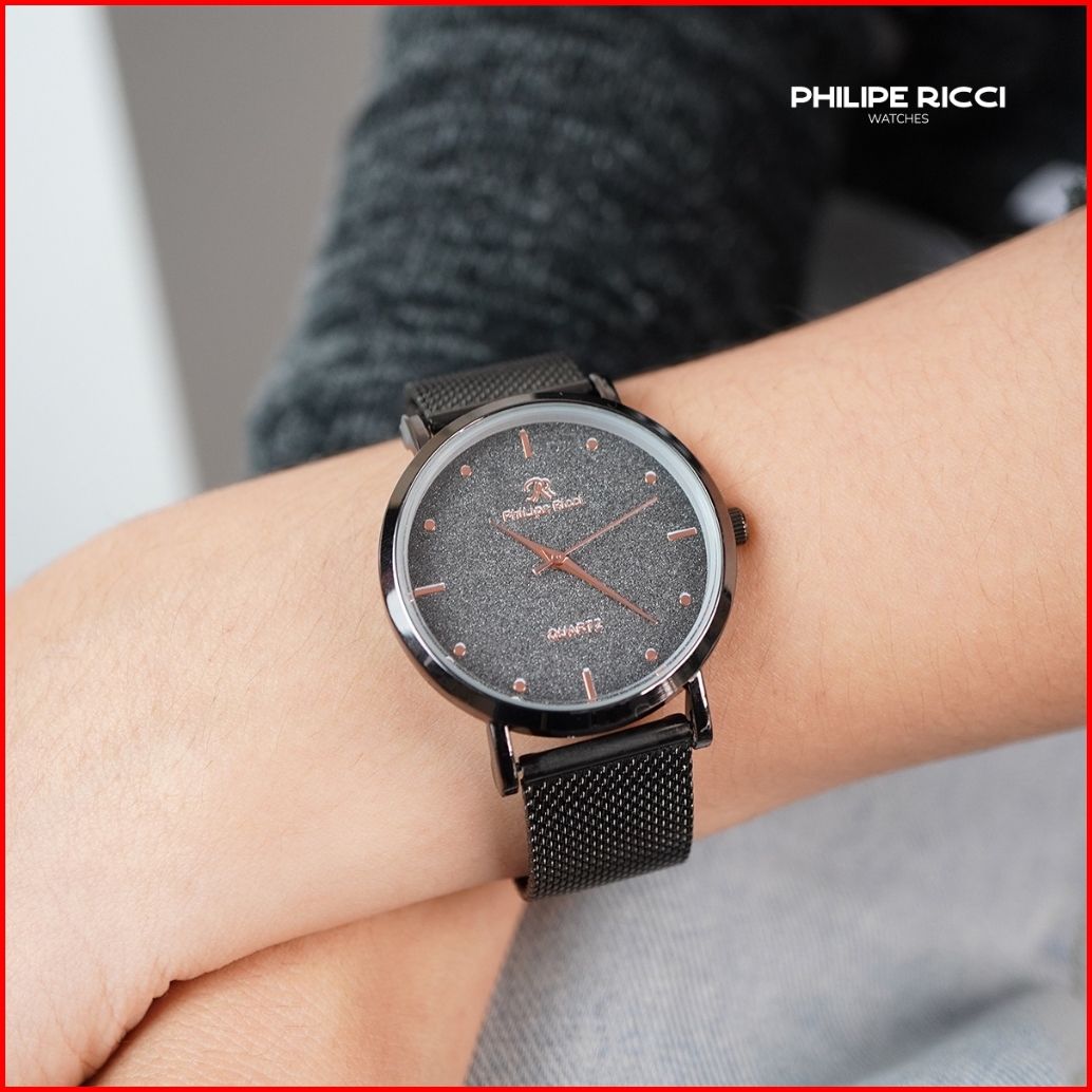 Philipe Ricci Jam Tangan Wanita Rantai Pasir Bulat Tipis Desain Kekinian 7488 Jam Cewek Rose Hitam