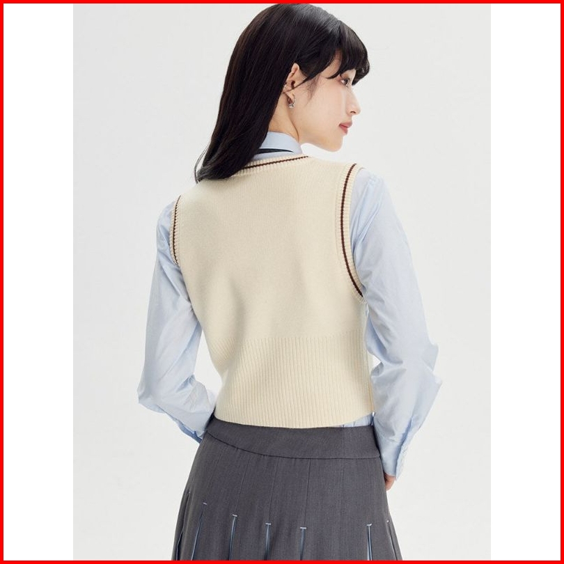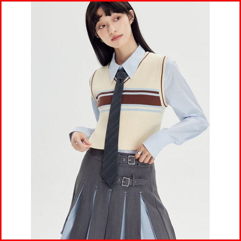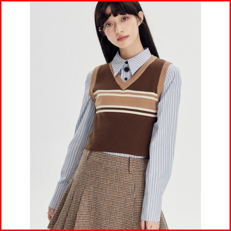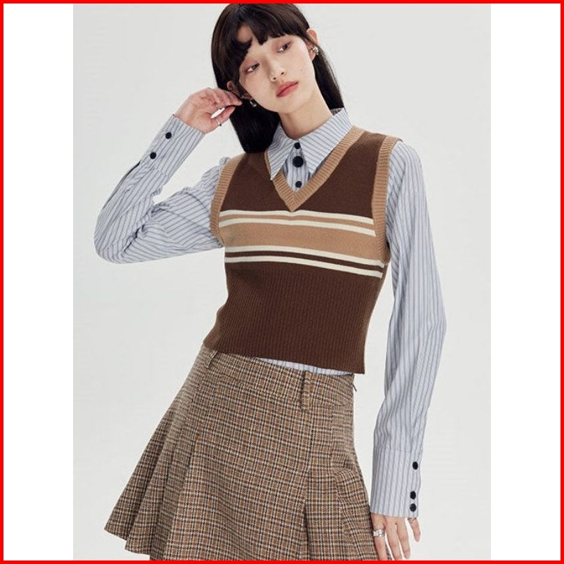 Knitt Vest Autumn Fashion Korean Style Rajut V-neck Setripe Atasan Rompi Wanita Baju Luaran Nya Saja