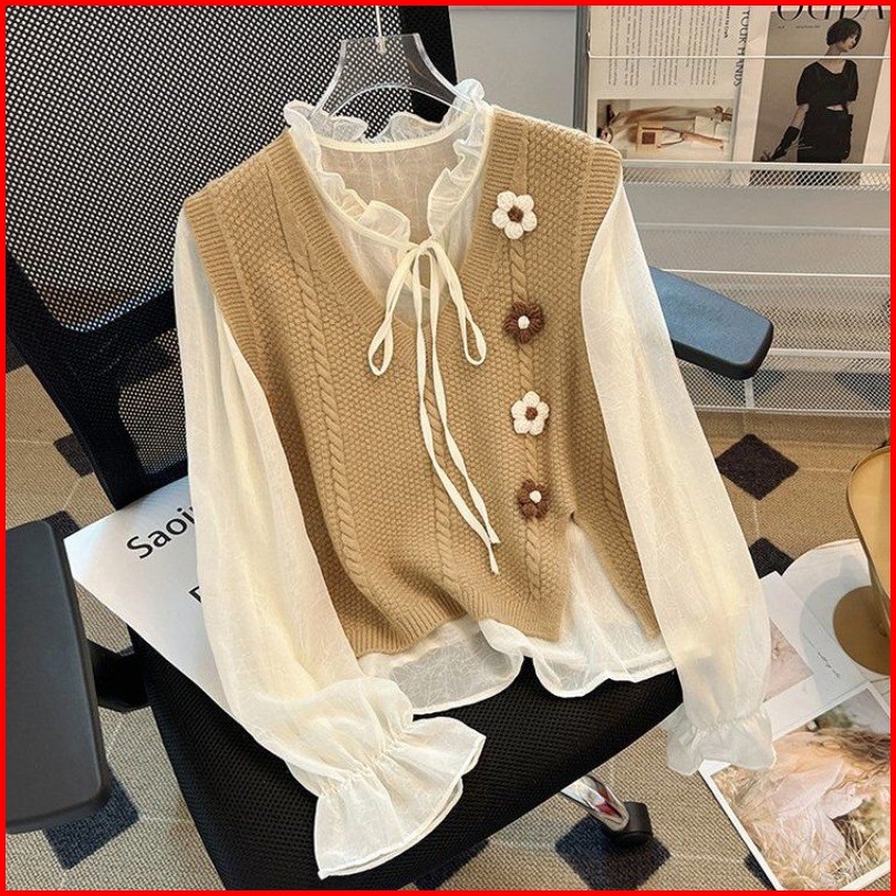 Fx Shop Vest Flow V-neck Knitted Atasan Wanita Rompi Korean