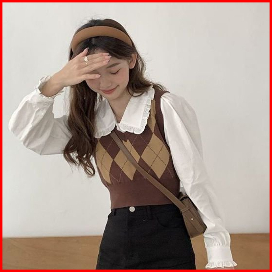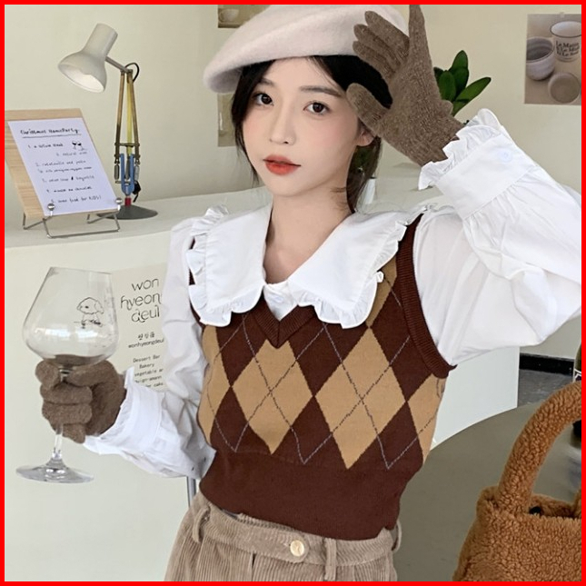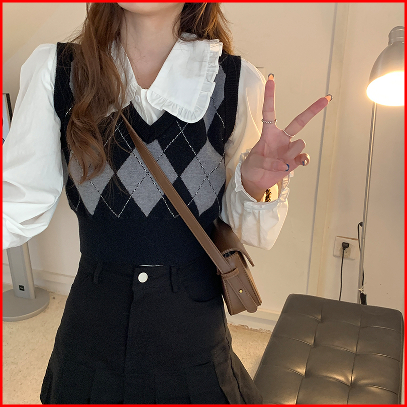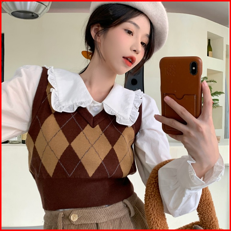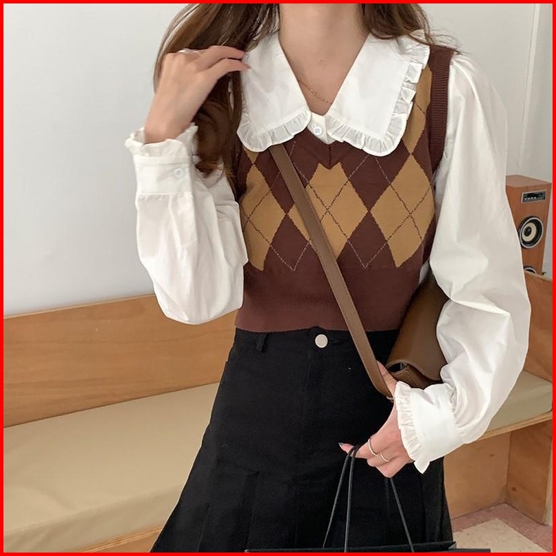 Korea Rompi Preppy Style Knitted Plaid Crop Top Pendek Vest