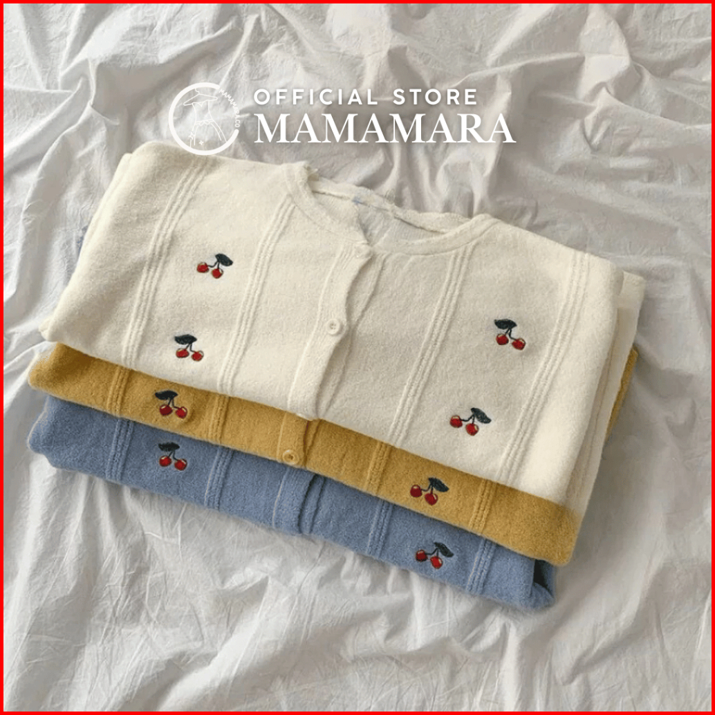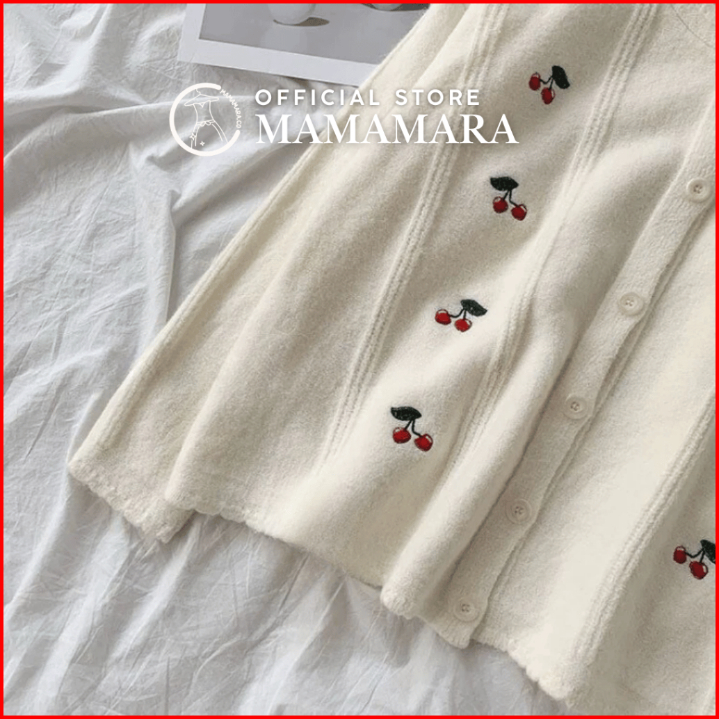 Mamamara - Cardigan Rajut Wol Knitwear Kardigan Korean Cherry Bordir Kancing Aktif Crew Neck Santai Setrip Bunga Polos