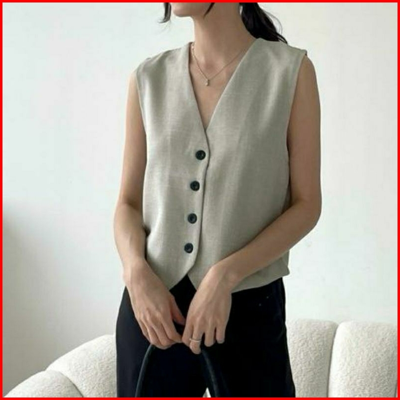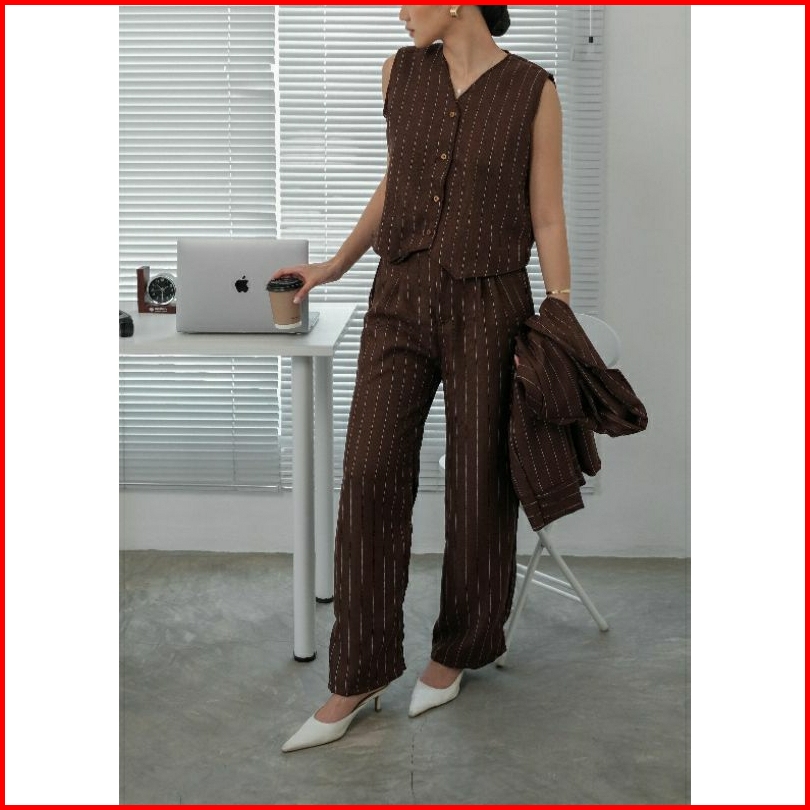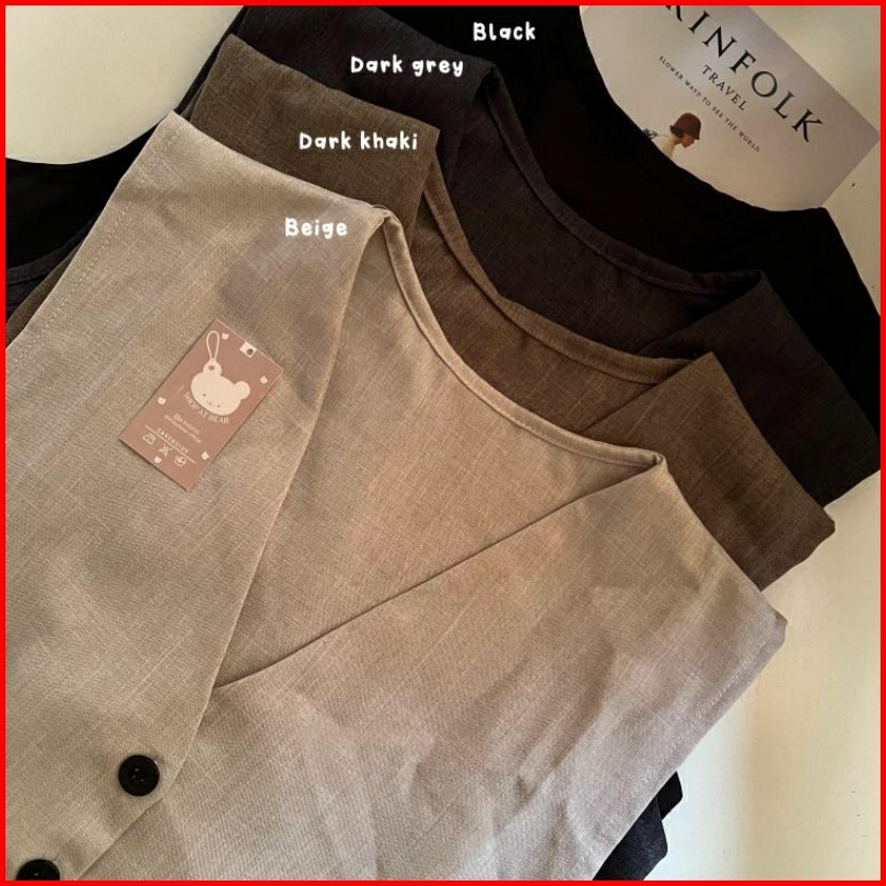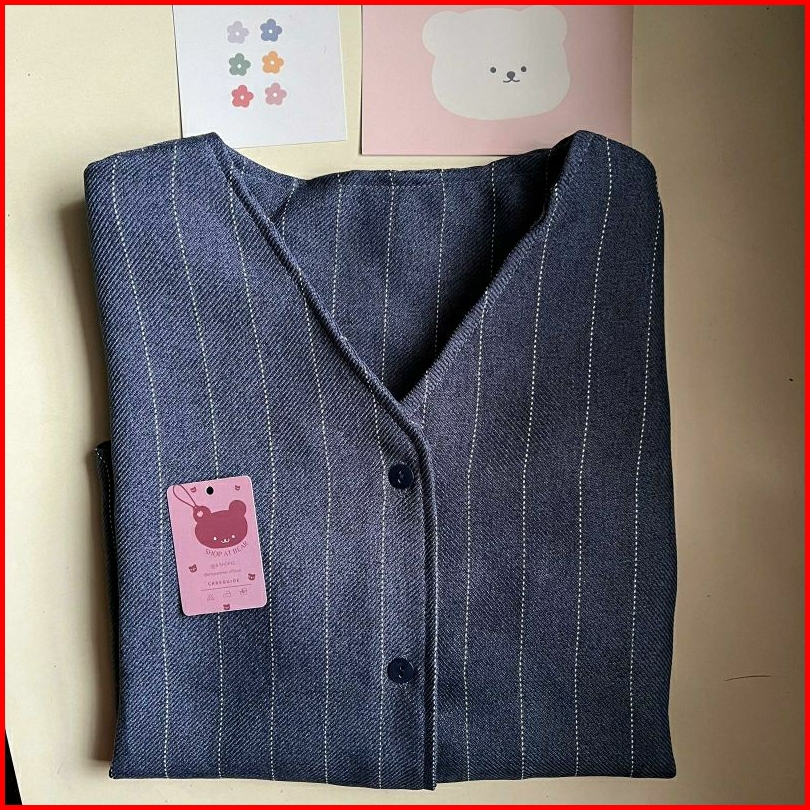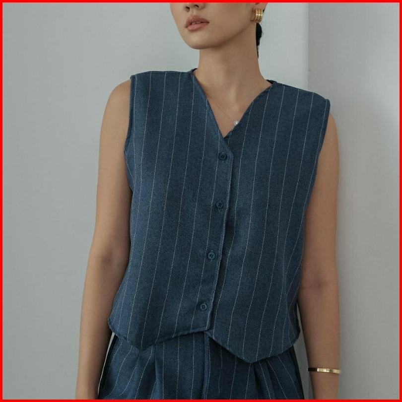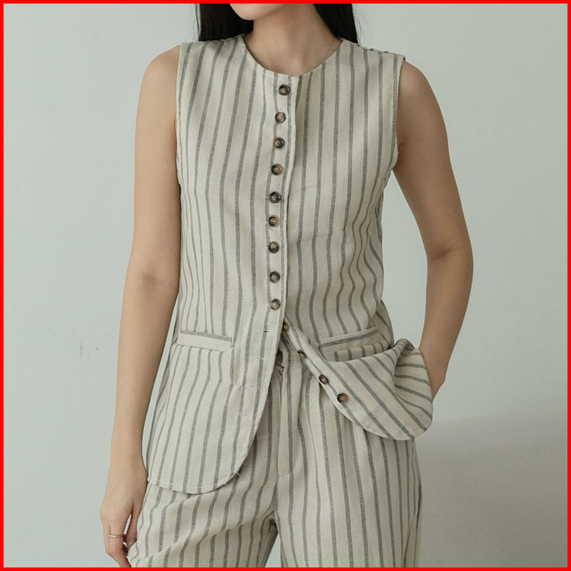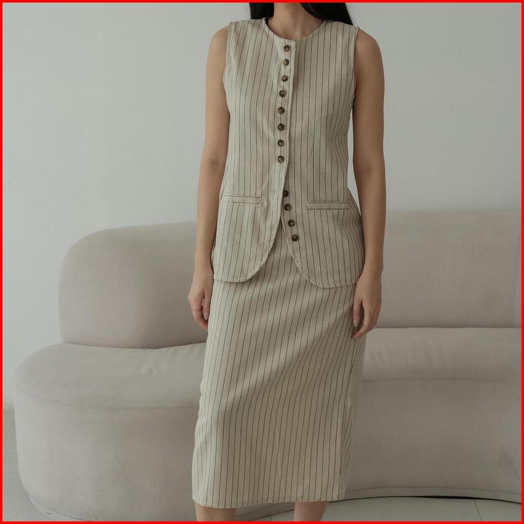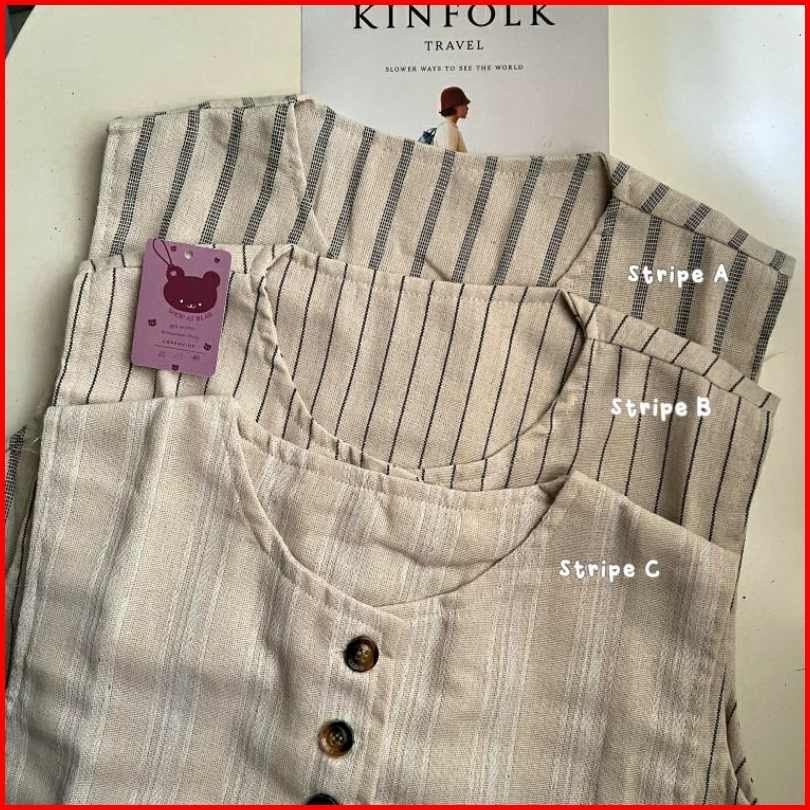 Nicole Korean Crop Stripes Vest Beige Cream Blouse Salur Vest Linen Wanita Stripe Vest