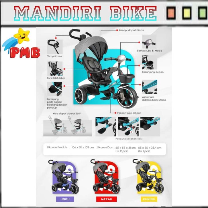Tricycle PMB Iora Seri T-16 Sepeda anak Roda 3 Dorongan Musik Sepeda anak roda tiga Murah Terlaris