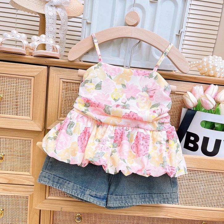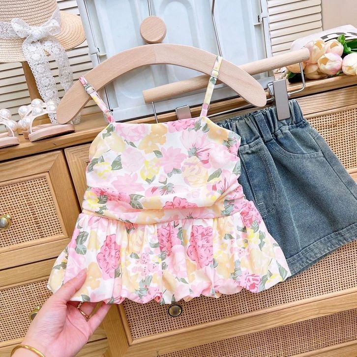 363856 Oneset 2in1 Cantik Setelan Baju Atasan Blouse Tanpa Lengan Bawahan Celana Pendek Denim Fashion Anak Perempuan