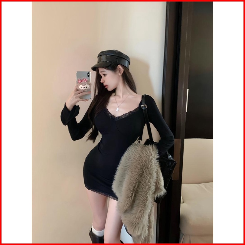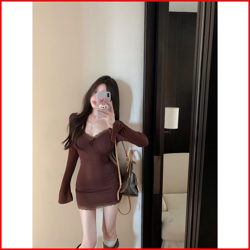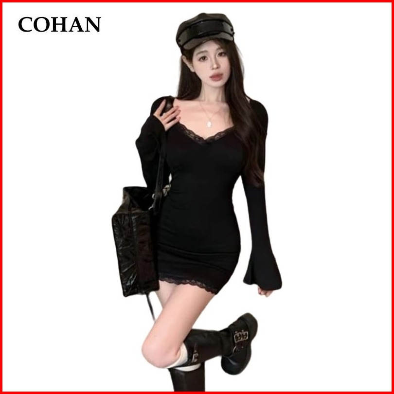 Cohan Dr9135 Dresses Bodycon Long Sleeve V-neck Mini Seksi Slimbody Hitam Cream Coklat Elegant S M L Xl
