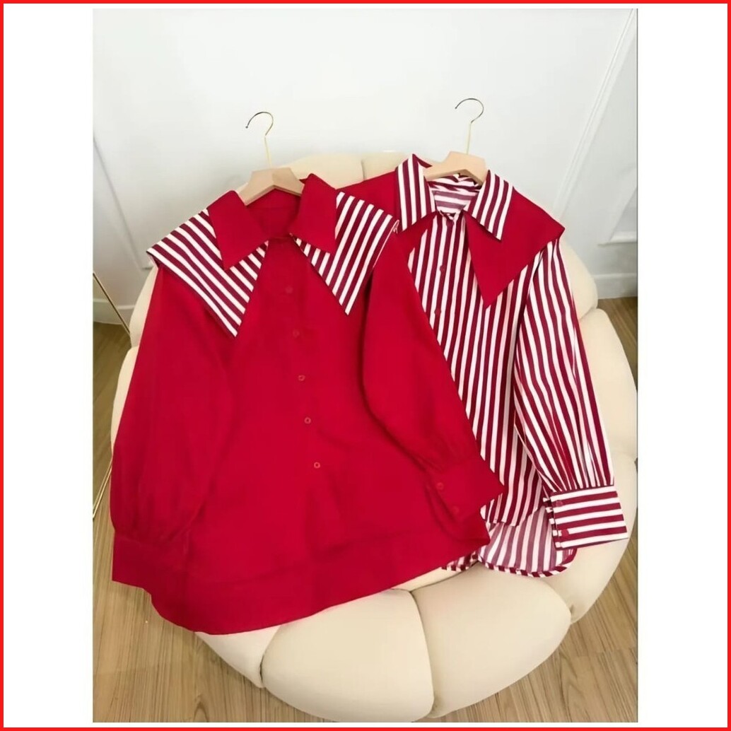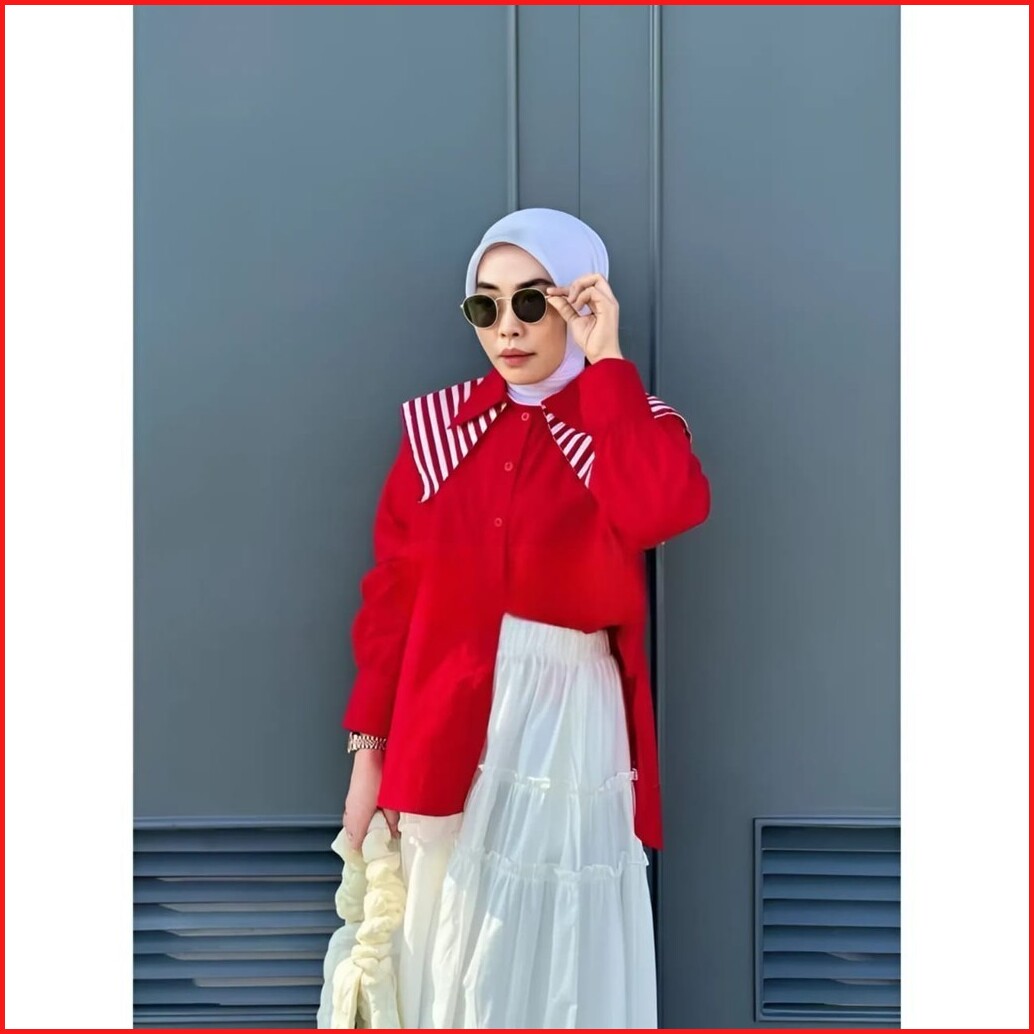 Vallina Outfit - Lista Top Blouse Atasan Wanita Muslim Merah Putih L 17 Agustus Matt Cringkle Mix Katun Salur Premium