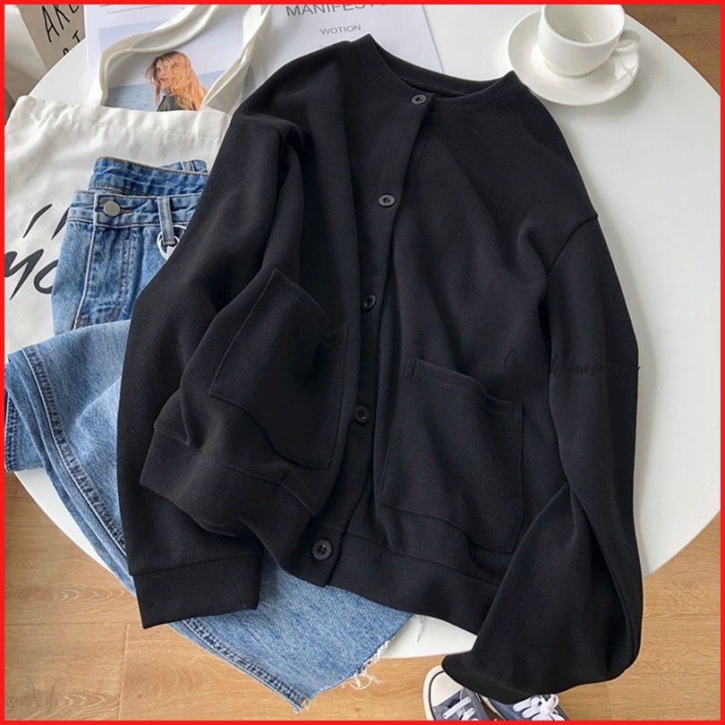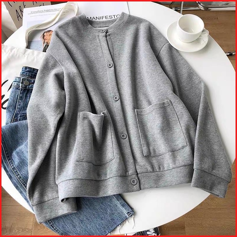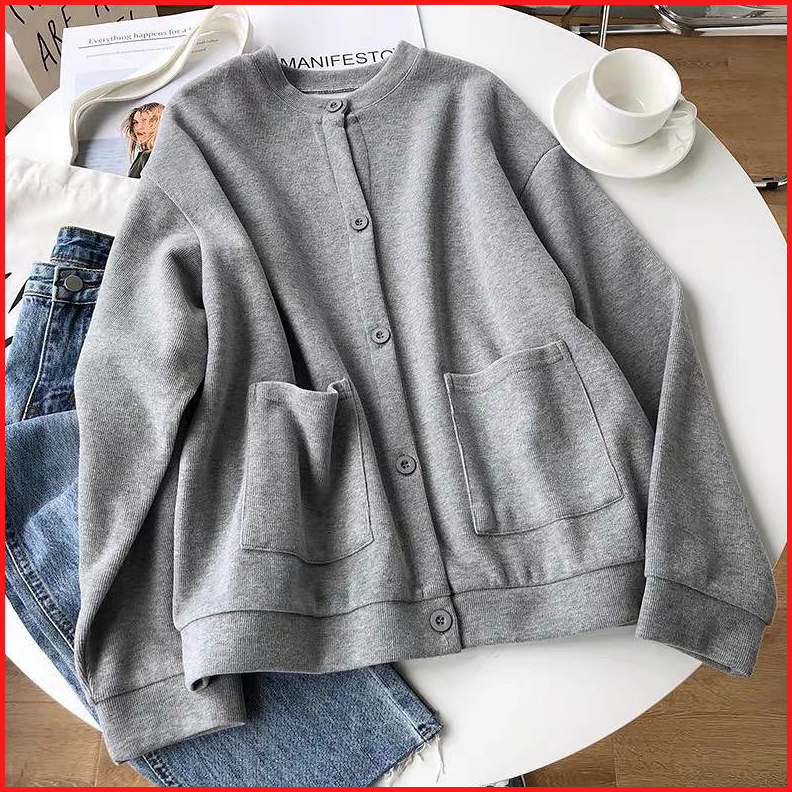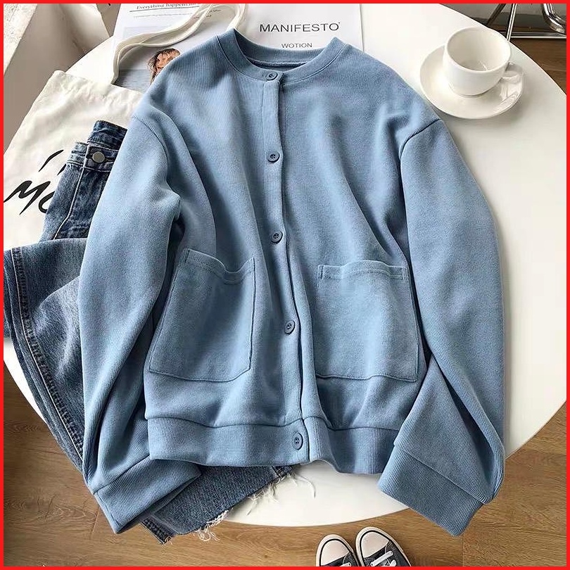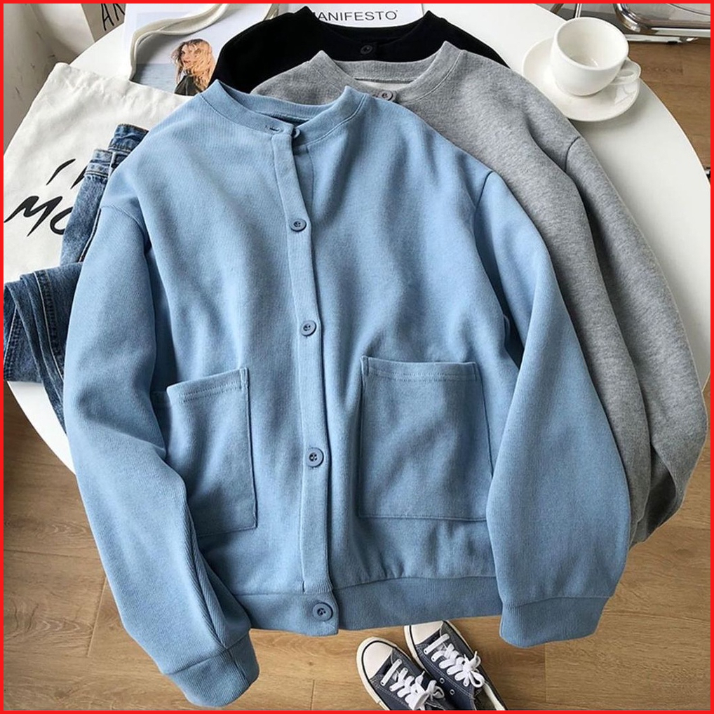 Vallina - Lamina Outer Plain Button Pocket Premium Outerwear Cardy Fleece Tebal Remaja Wanita Korean Style