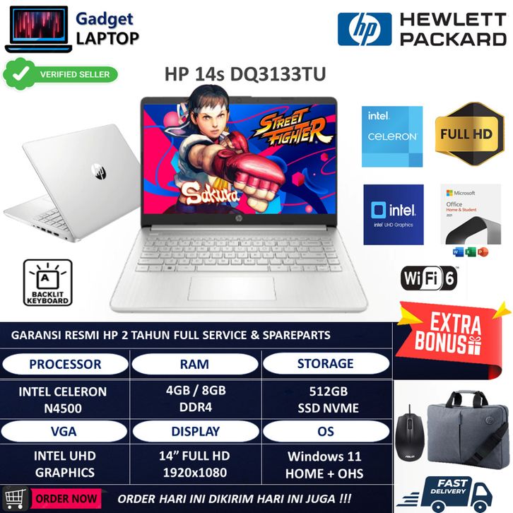 LAPTOP HP 14S DQ3133TU DQ3134TU INTEL N4500 4GB 8GB SSD512GB WINDOWS OFFICE NEW ORIGINAL GARANSI RESMI TERLARIS 2025